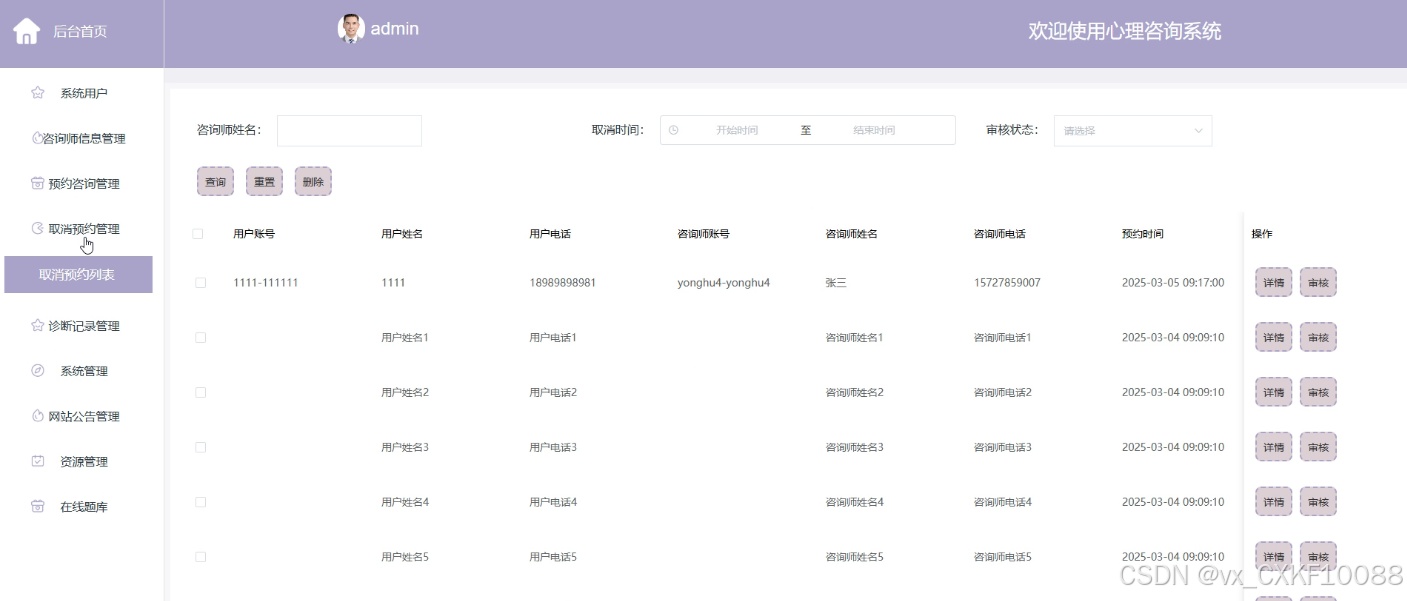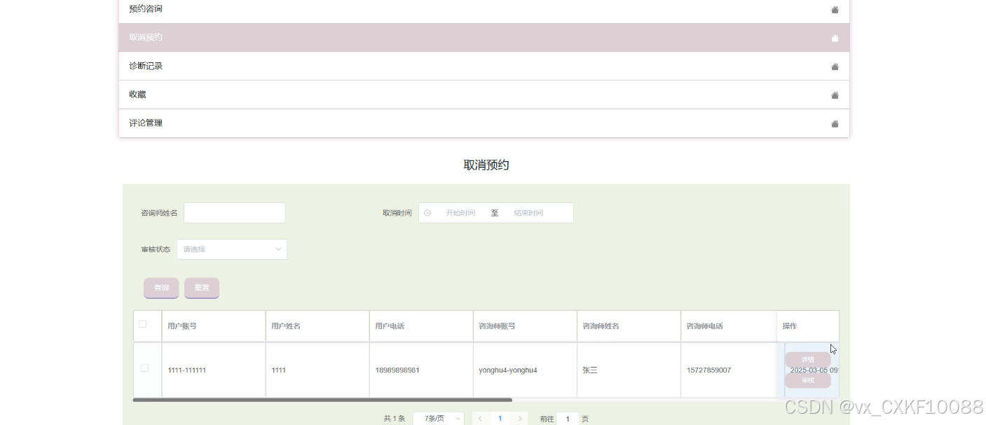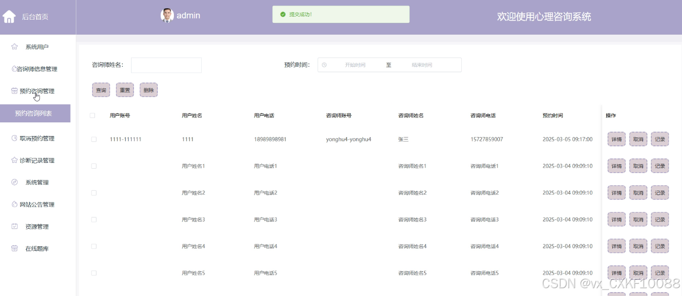 - 预约咨询管理:此模块为管理员提供了一个查看和管理预约咨询的平台。管理员可以对不合适的预约进行删除操作,查看预约的详细信息,执行取消预约的操作,并记录下相关的管理活动,确保预约流程的顺畅和用户的满意度。