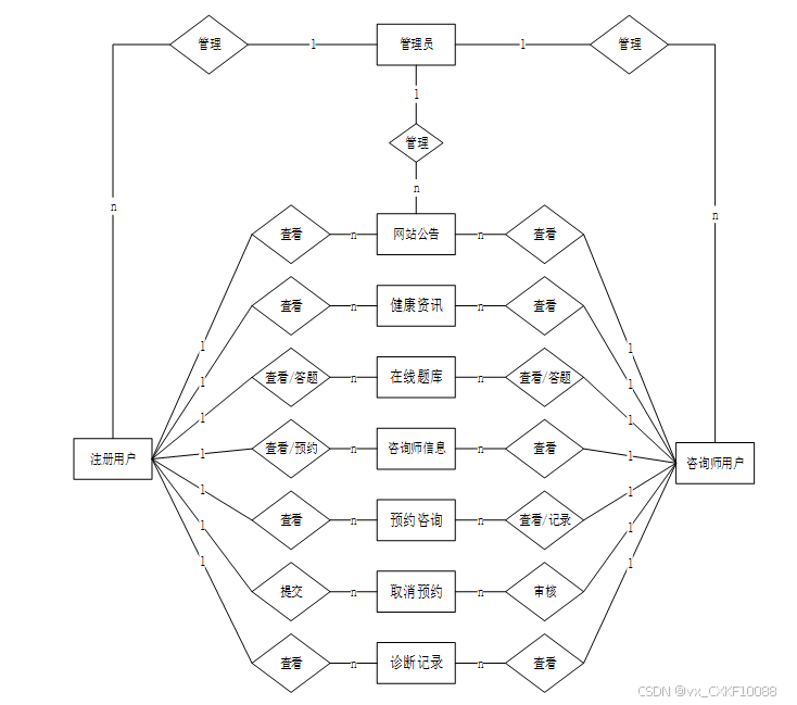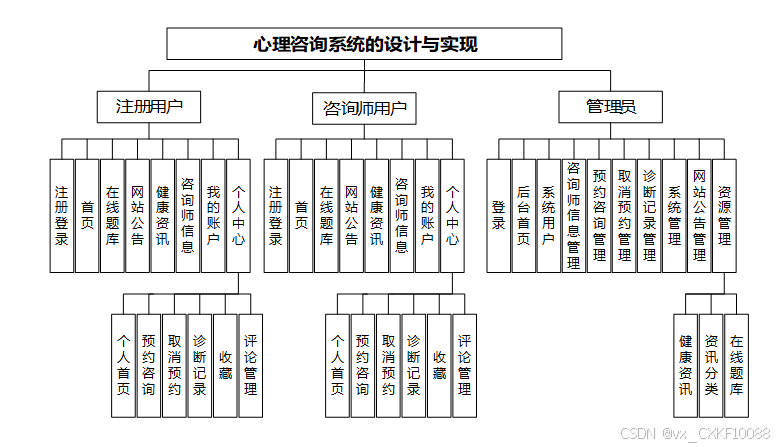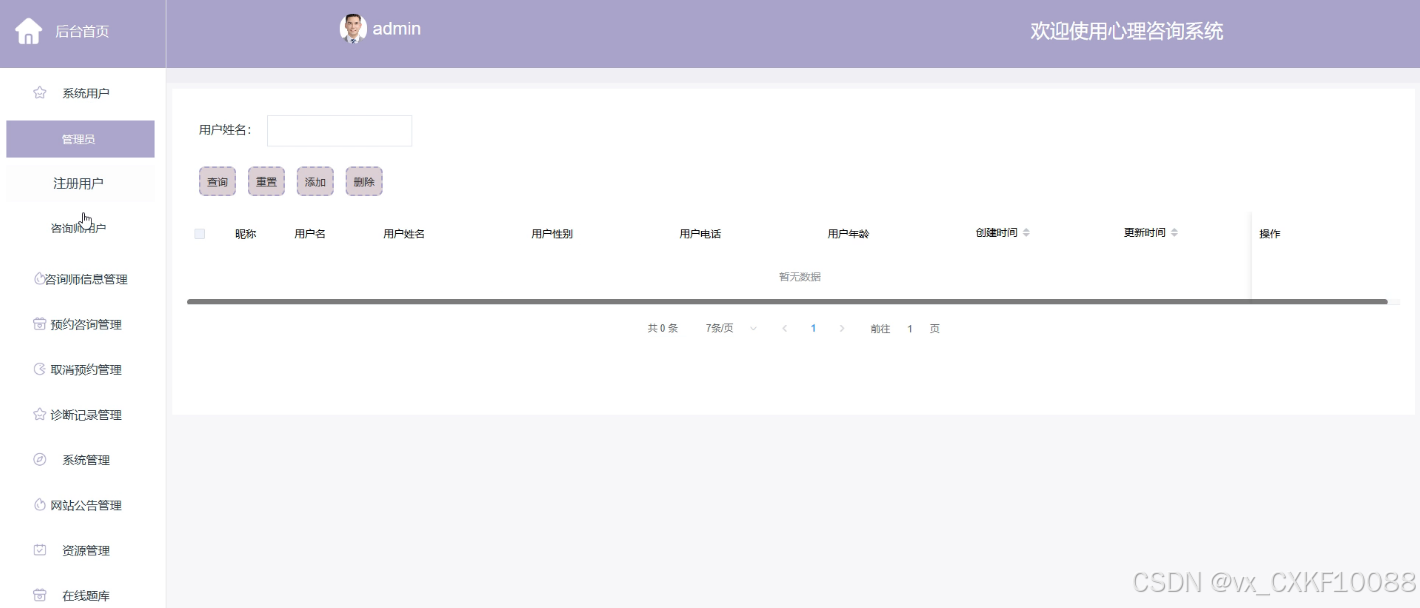 - 系统用户管理:在这个模块中,管理员拥有对不同类型的用户账户进行管理的权限,这些账户类型包括但不限于管理员账户、注册用户账户以及咨询师用户账户。管理员可以执行添加新用户、删除现有用户或查询用户信息的操作,并且能够详细查看每个用户的个人信息、账户状态以及其他相关资料。
