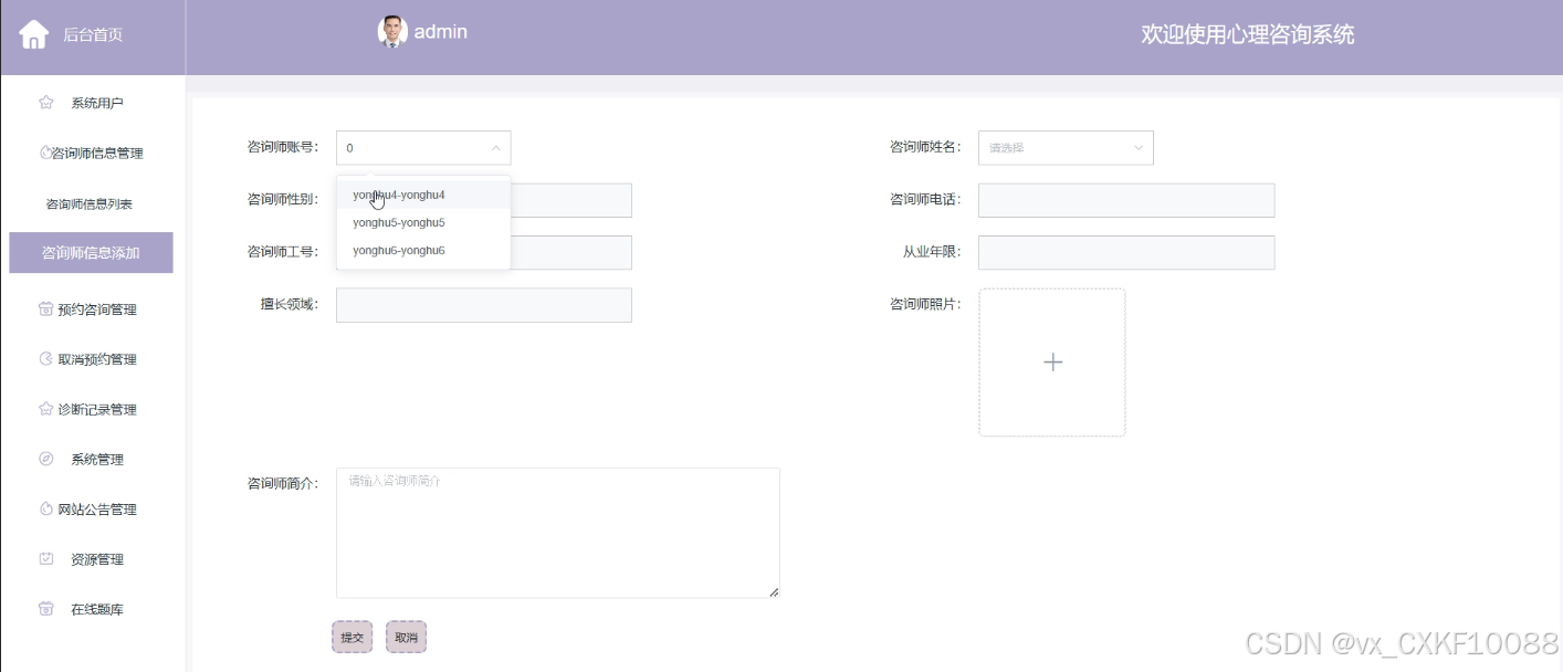 - 咨询师信息管理:管理员负责对咨询师的信息进行全方位的管理。管理员可以添加新的咨询师到系统中,也可以根据需要删除或查询现有的咨询师信息。此外,管理员还可以查看咨询师的详细资料和用户对他们的评论,以便更好地了解咨询师的工作表现和服务质量。