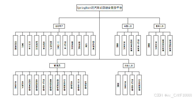 SpringBoot的汽车4S店综合服务平台模块设计是系统开发的核心部分,它通过将系统功能拆分为多个独立的模块,使得每个模块具有明确的职责和操作。每个功能模块都应当具备良好的扩展性、可维护性和高效性,确保系统能够高效运行并易于后期的更新与优化。通过模块化设计,能够有效提升系统的可管理性和用户体验,满足不同用户群体的需求。每个角色对应的功能模块如图所示。