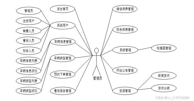 在基于SpringBoot的汽车4S店综合服务平台中,管理员主要包括后台首页、系统用户、车辆信息管理、车辆类型管理、预约下单管理、售后服务管理、维修保养管理、财务报表管理、系统管理、网站公告管理、资源管理。管理员用例图如下所示: