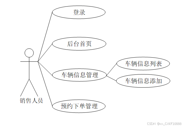 在基于SpringBoot的汽车4S店综合服务平台中,销售人员主要包括登录、后台首页、车辆信息管理、预约下单管理。销售人员用例图如下所示: