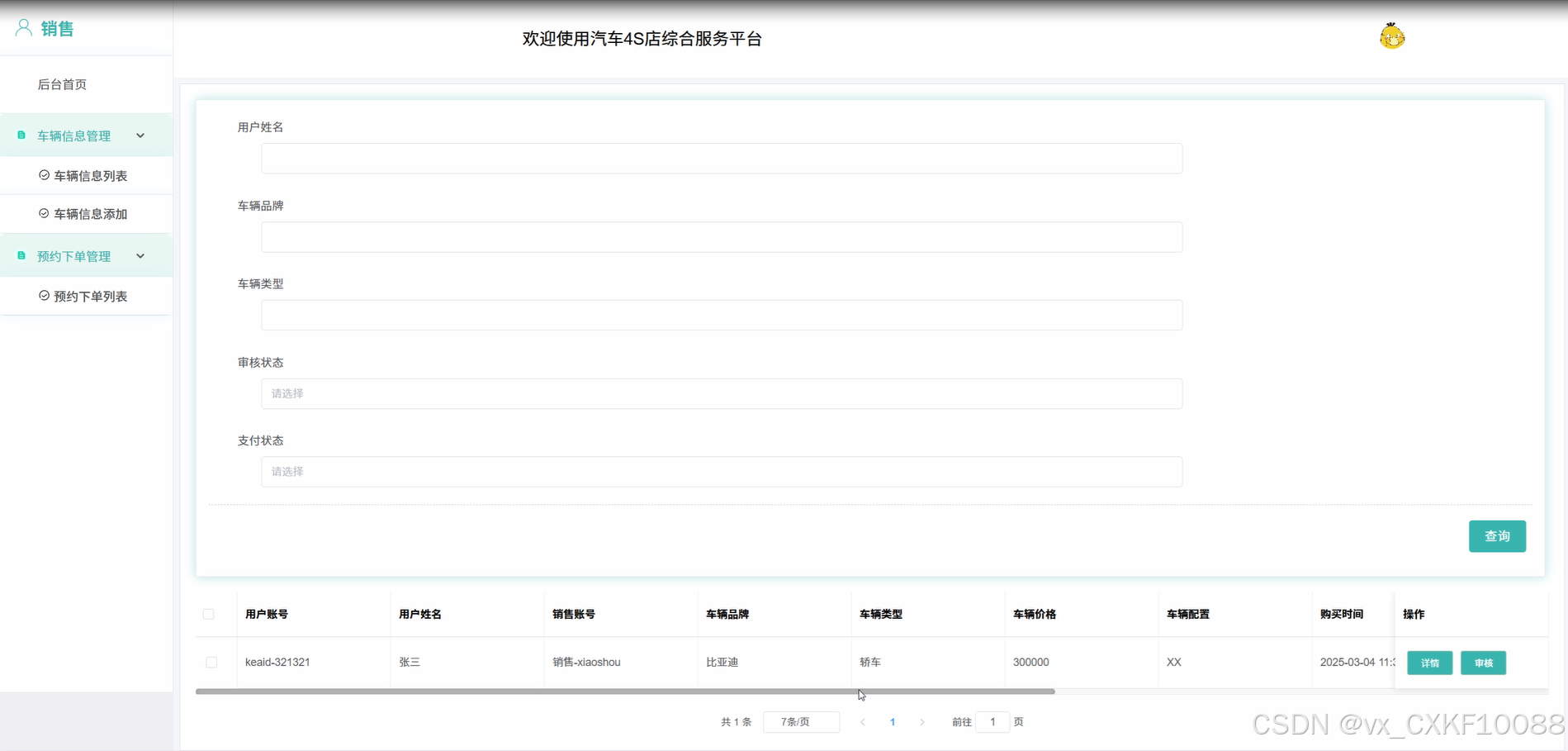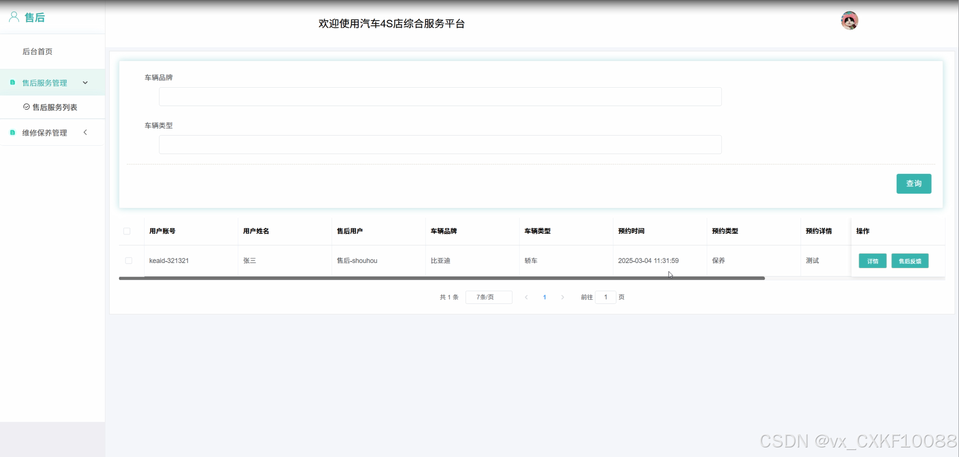 通过本次的开发汽车4S综合服务平台,基于SpringBoot技术成功实现了高效、模块化的系统架构,充分展现了开发团队在系统设计、技术实现及用户体验优化方面的综合能力。系统围绕汽车销售与售后服务环节,结合实际业务需求,构建了涵盖车辆信息管理、预约服务、用户账户、售后跟踪等多功能的一体化平台。有效提升了汽车销售及服务流程的数字化水平,不仅为销售人员提供了便捷的数据管理工具,也为用户提供了直观、高效的服务体验,如预约登记、订单查询、信息修改等操作均可在线完成,极大提高了服务效率与用户满意度。