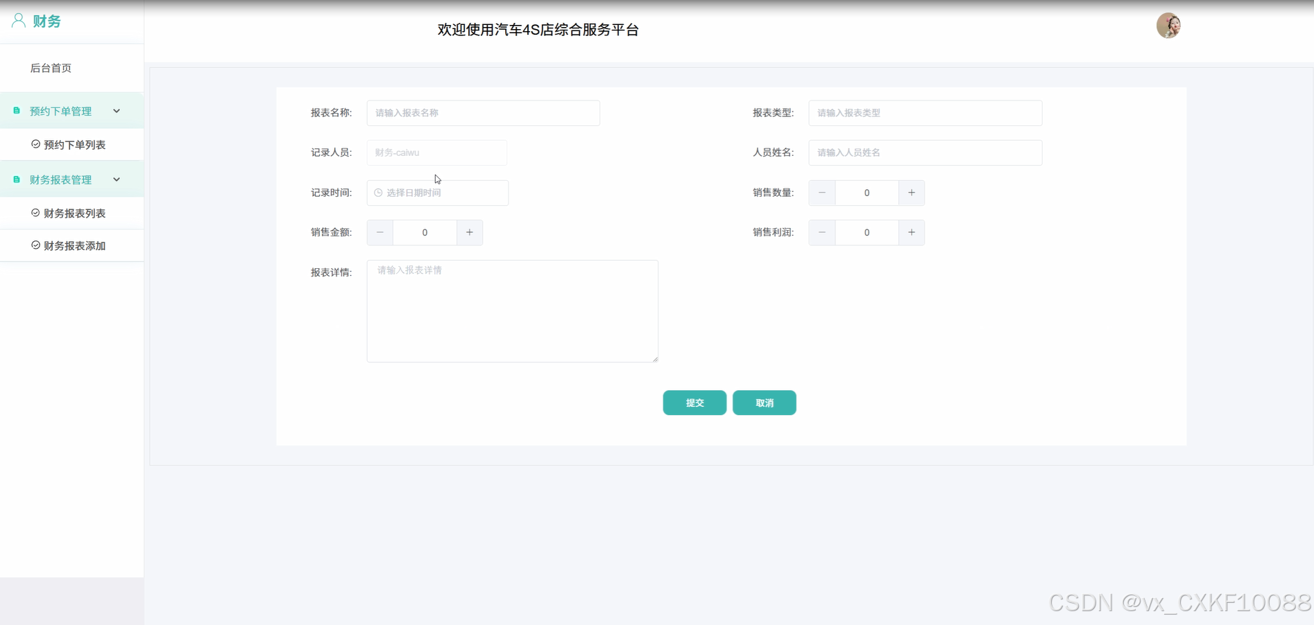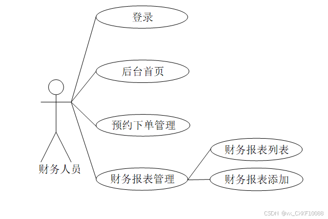 在基于SpringBoot的汽车4S店综合服务平台中,财务人员主要包括登录、后台首页、预约下单管理、财务报表管理。财务人员用例图如下所示: