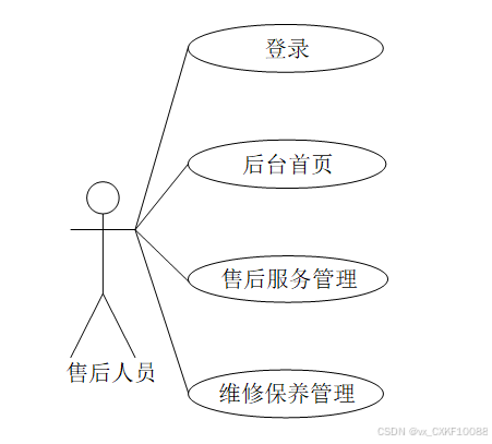 在基于SpringBoot的汽车4S店综合服务平台中,售后人员主要包括登录、后台首页、售后服务管理、维修保养管理。售后人员用例图如下所示: