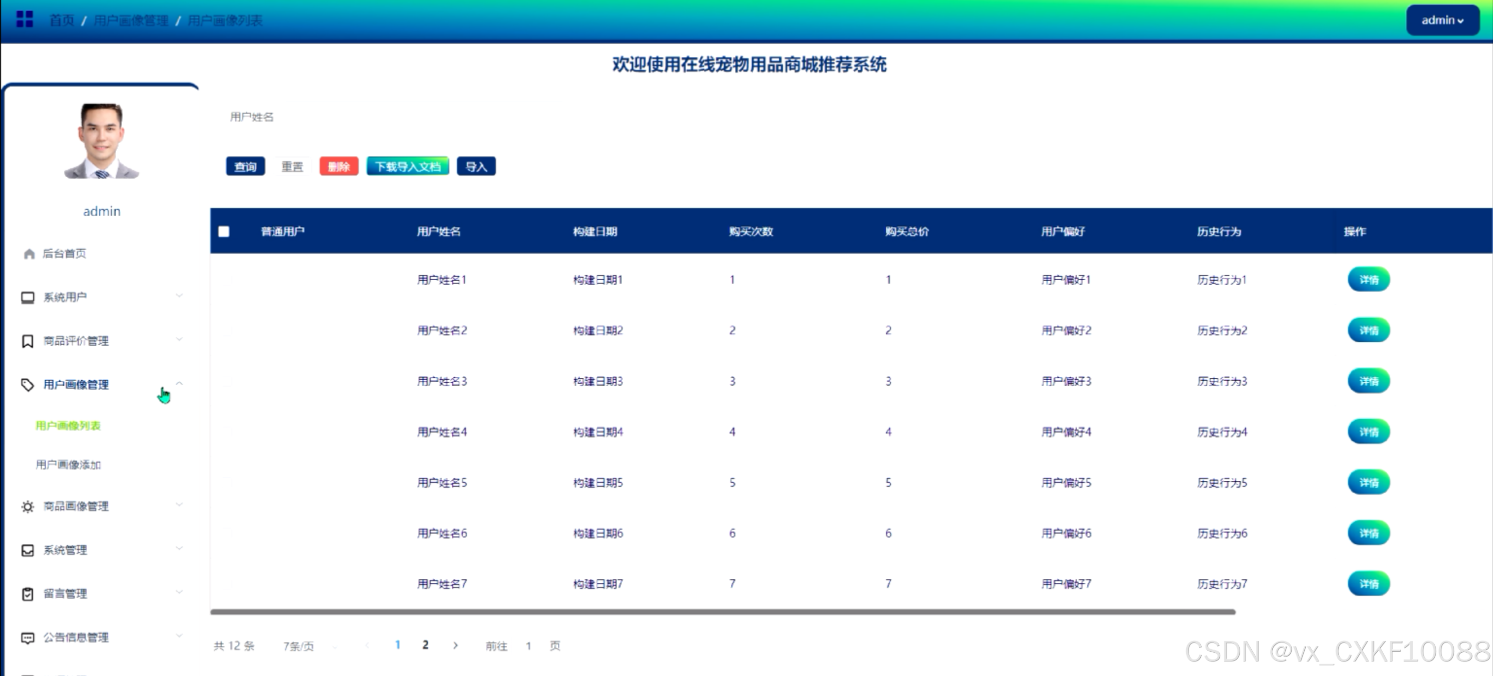 (5)用户画像管理:管理员可以通过用户画像管理功能查看和管理用户的详细信息。此功能允许管理员查询、重置、删除以及导入用户数据,以便更好地理解用户需求并提供个性化服务。通过分析用户的购买次数、购买总价、偏好和历史行为等信息,系统可以生成更精准的推荐内容,提升用户体验。