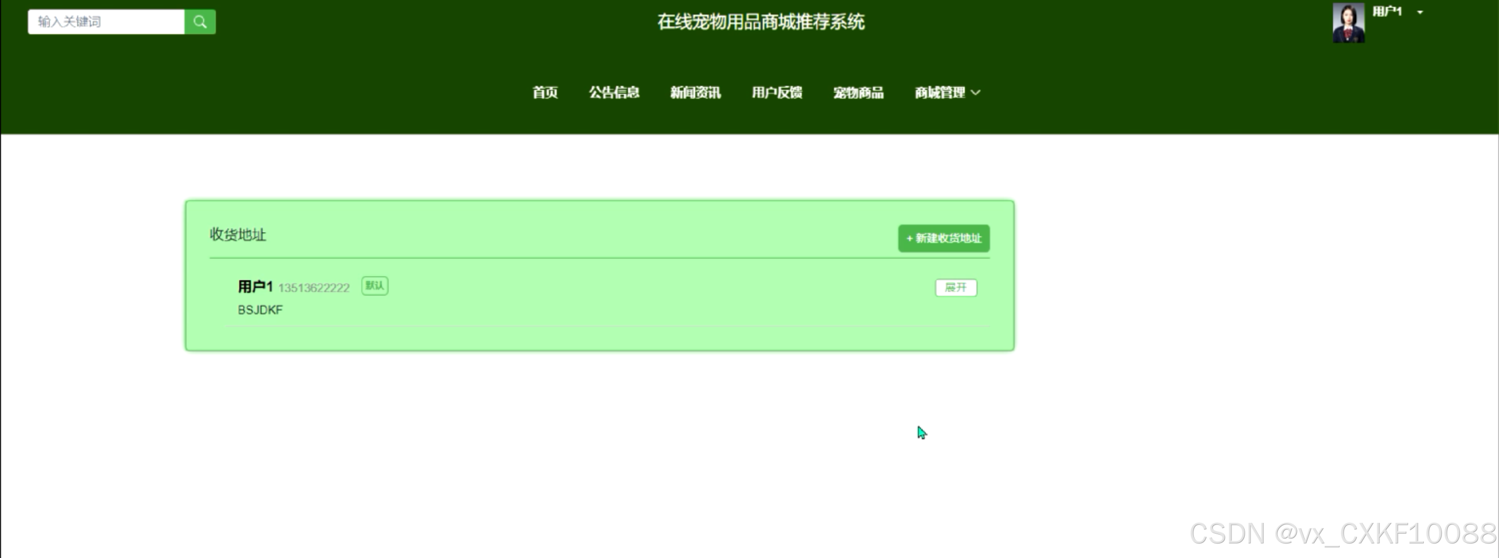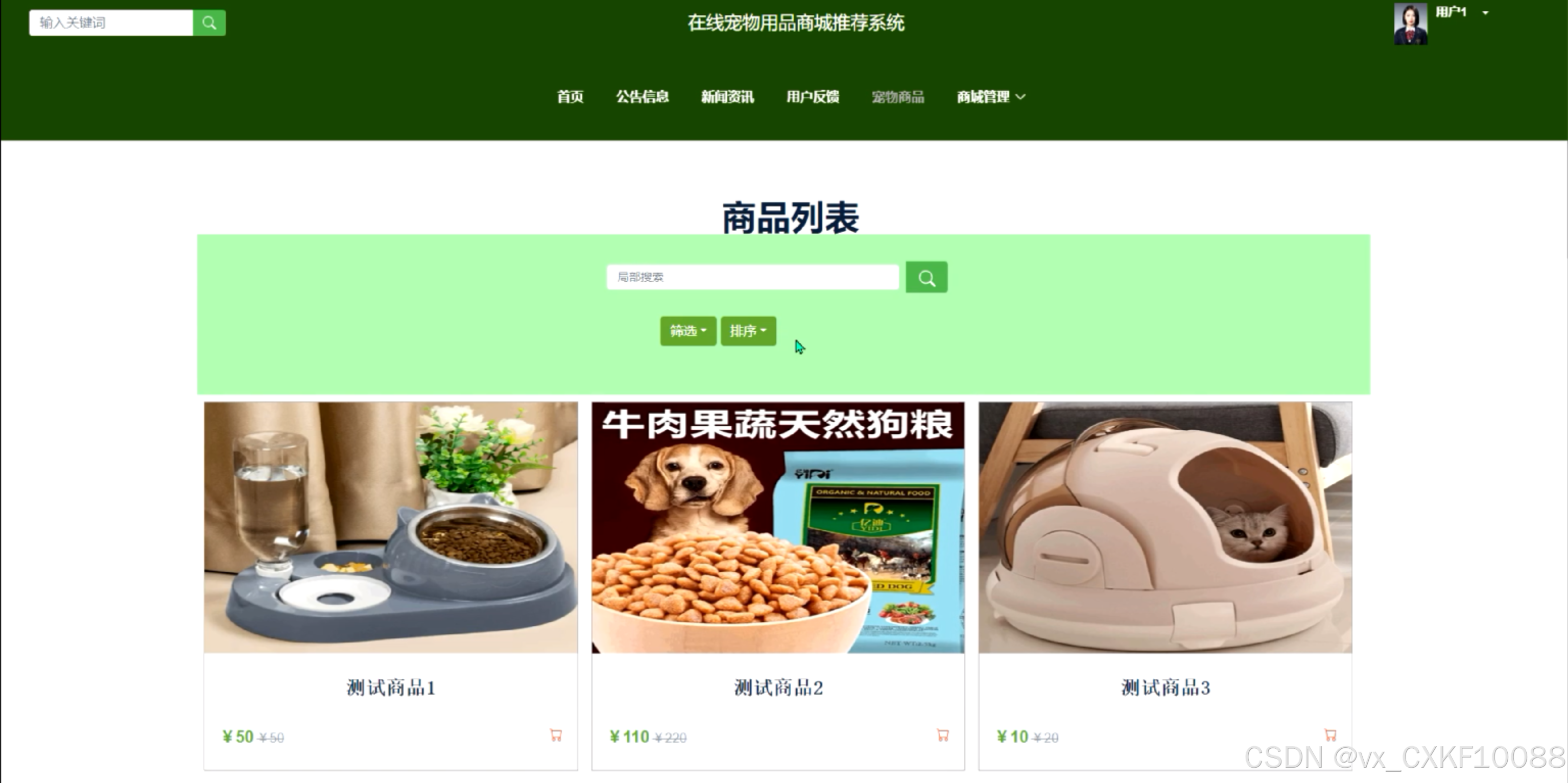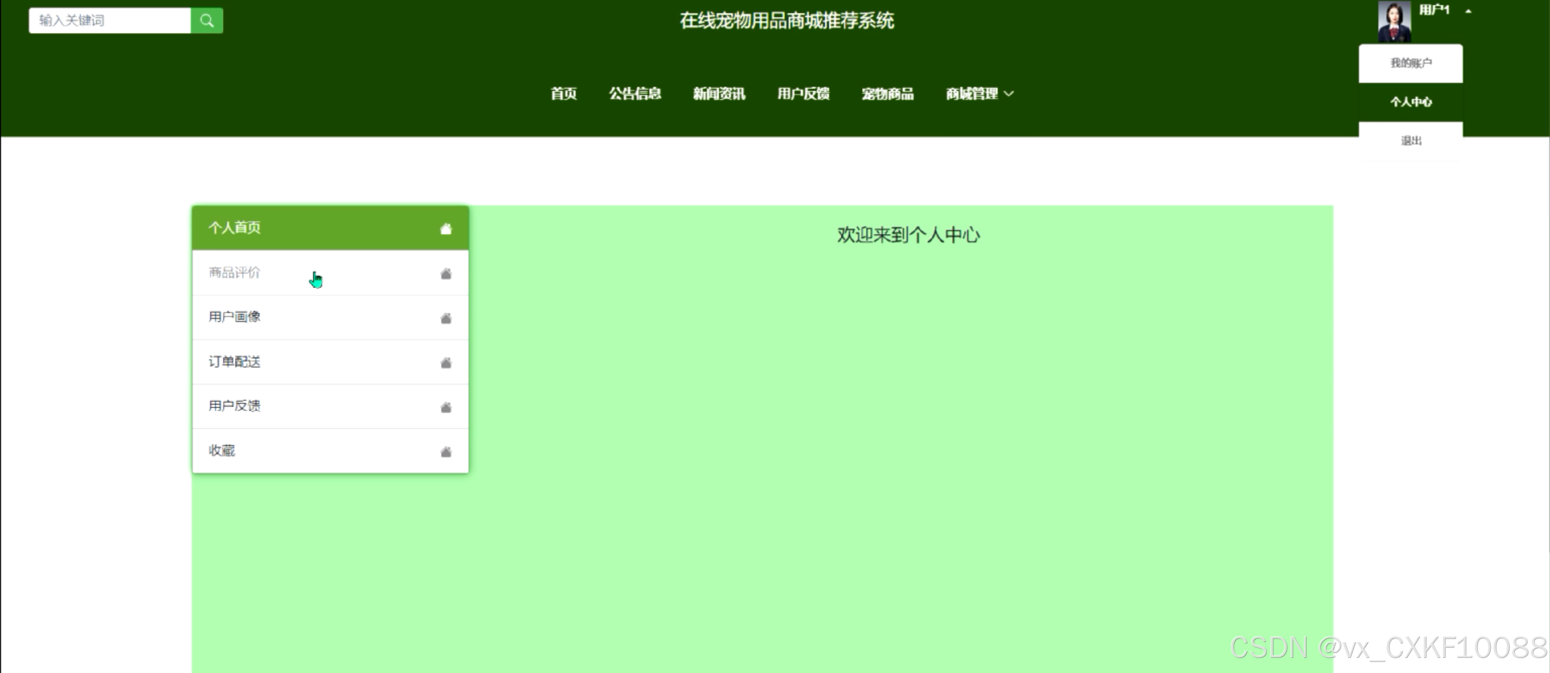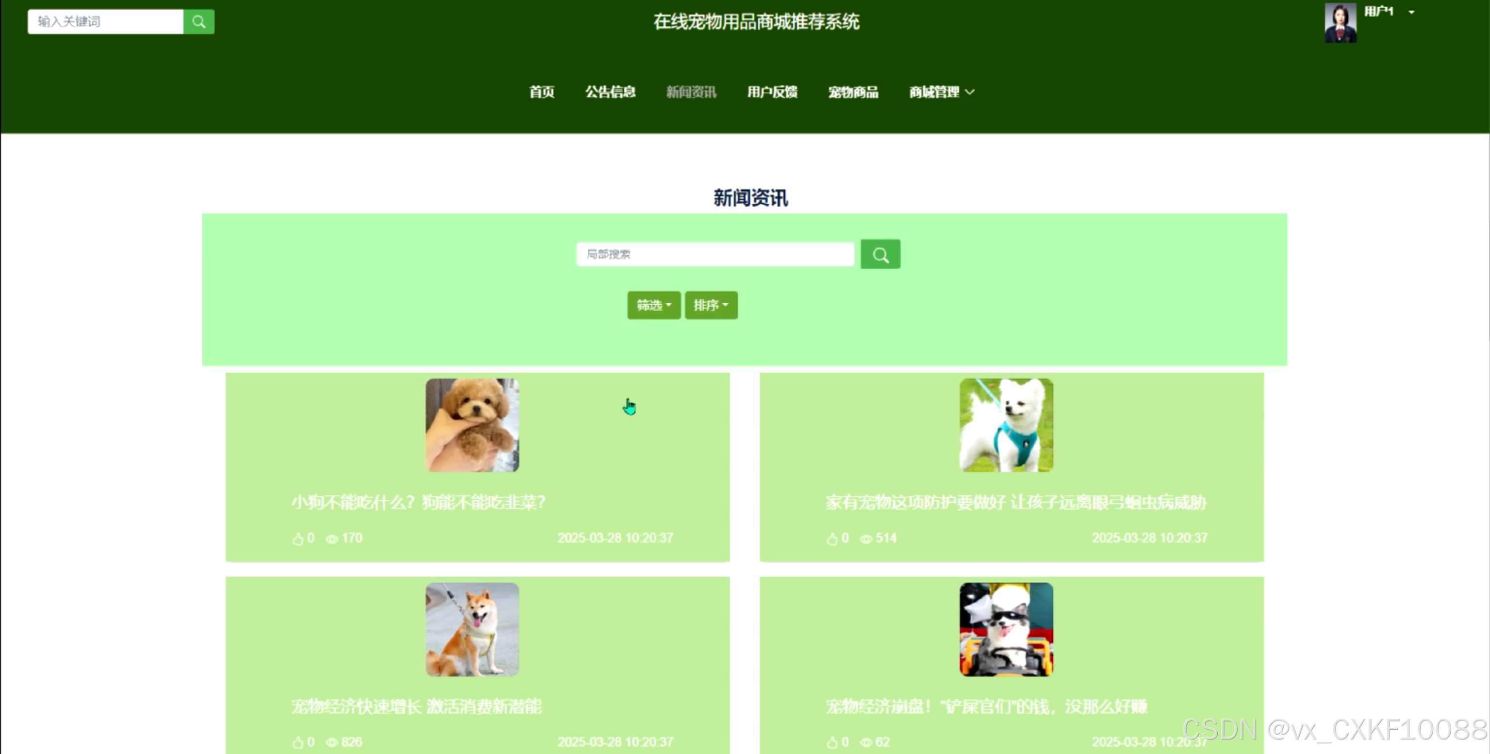 (2)首页:用户进入在线宠物用品商城推荐系统的时候,首先映入眼帘的是系统的公告信息、新闻资讯、用户反馈、宠物商品、商城管理等信息。