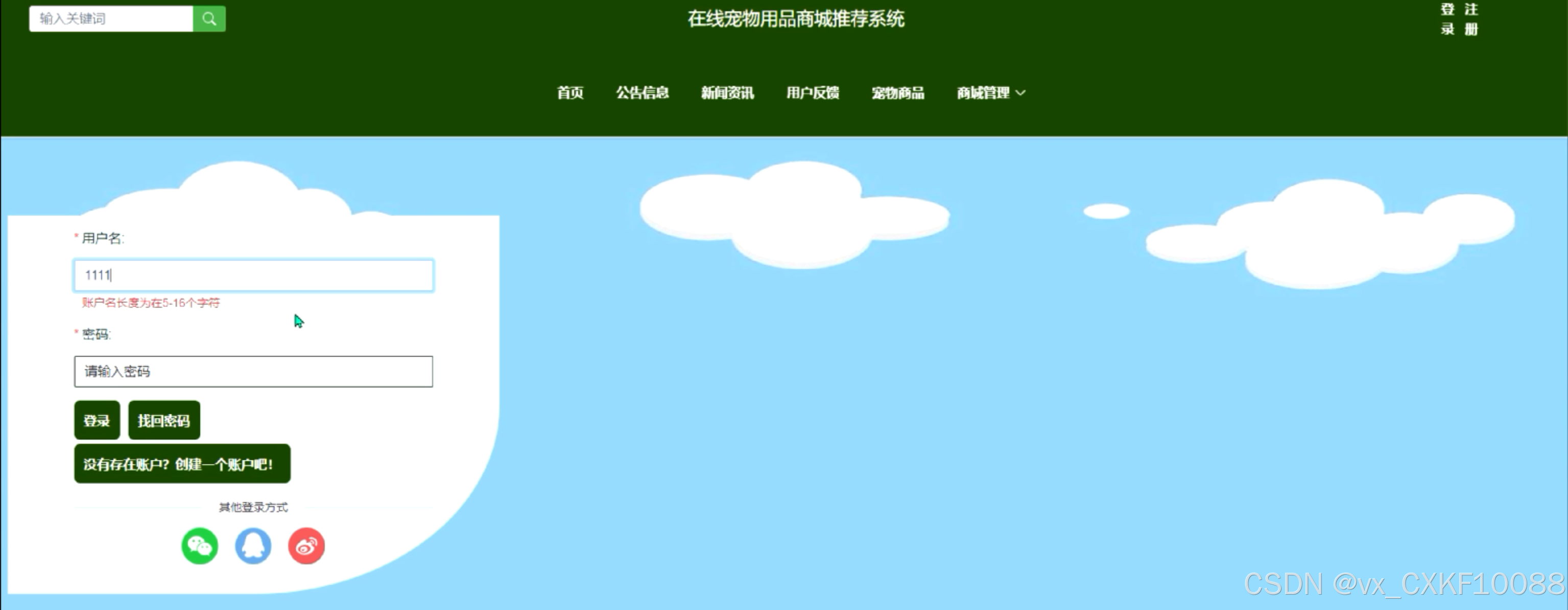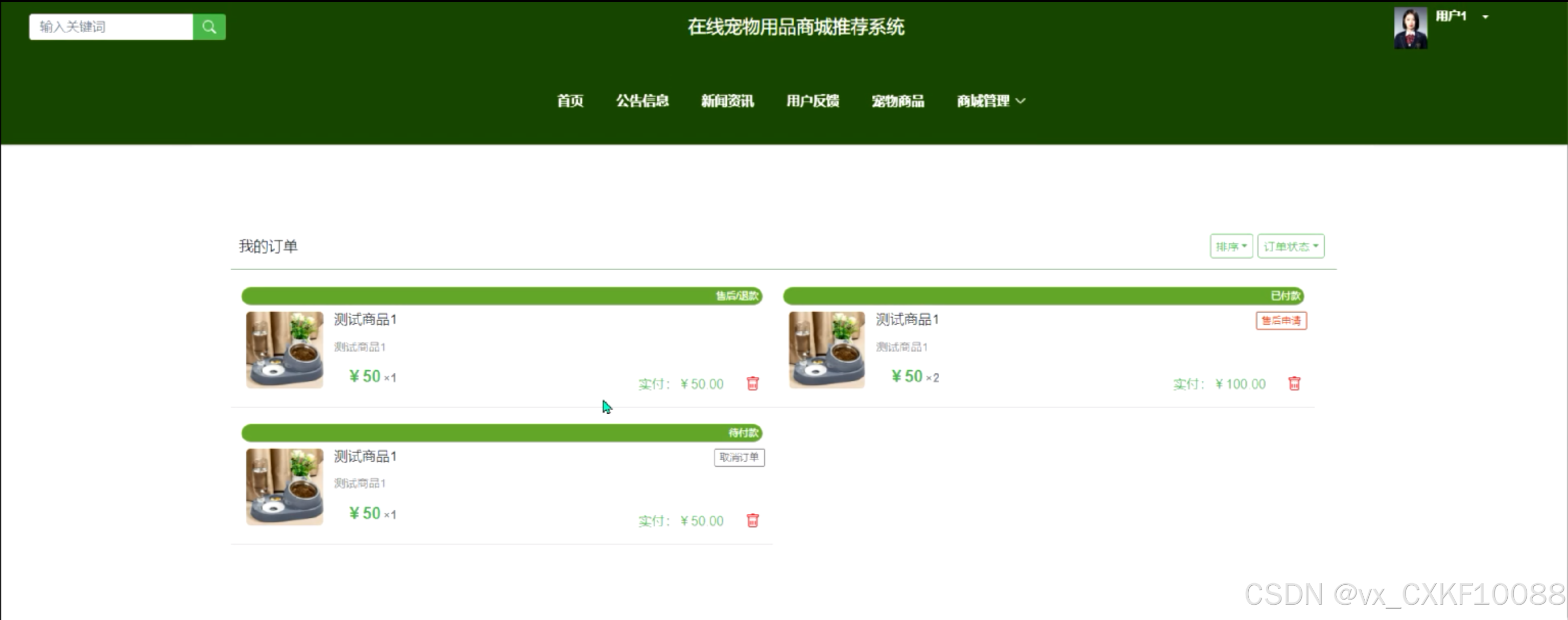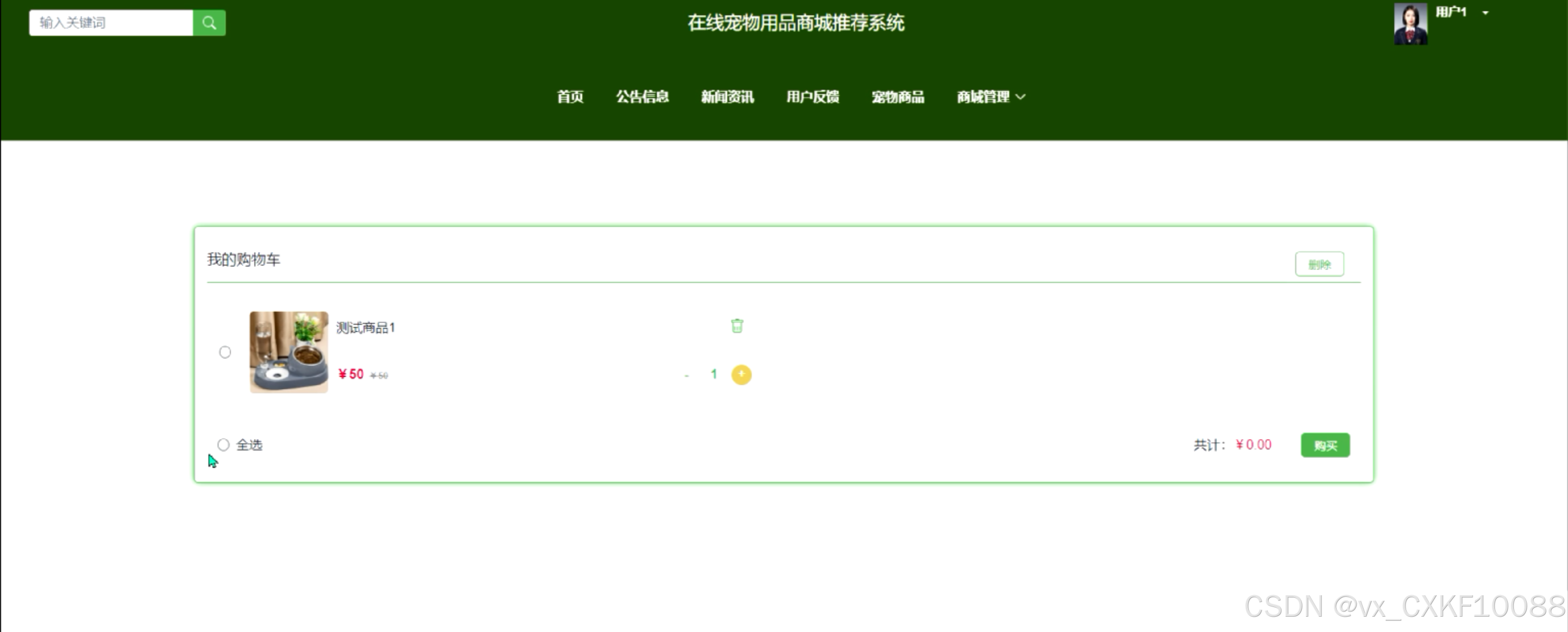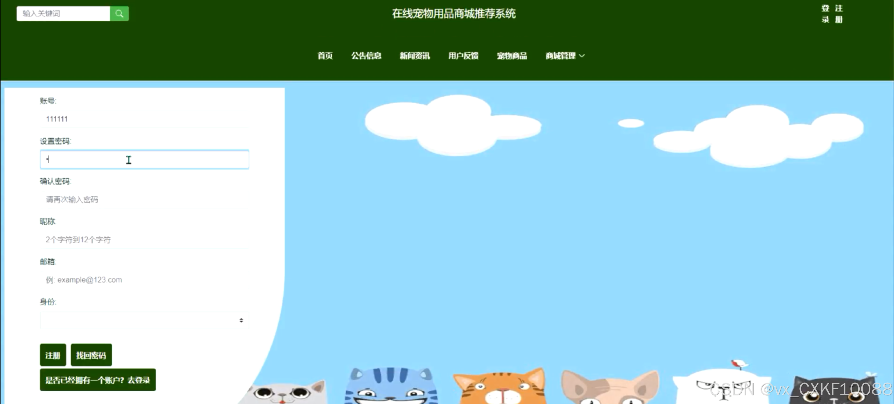 (2)首页:用户进入在线宠物用品商城推荐系统的时候,首先映入眼帘的是系统的公告信息、新闻资讯、用户反馈、宠物商品、商城管理等信息。