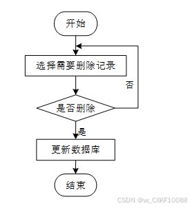 用户选择需要删除的记录后,系统判断是否确认删除。若未确认,返回选择环节;若确认删除,则更新数据库,删除对应记录,完成操作后流程结束。删除信息流程图如图2-7所示。