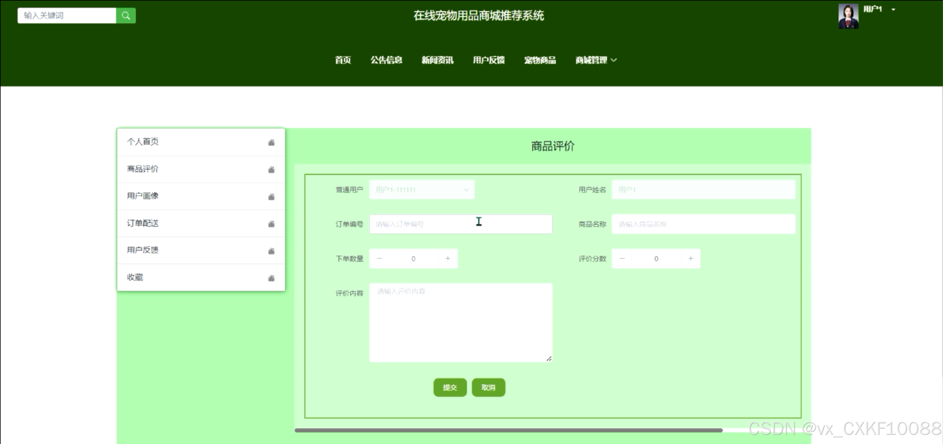 商品评价:用户点击可添加商品评价信息,包括普通用户、用户姓名、订单编号、商品名称、下单数量、评价分数和评价内容。