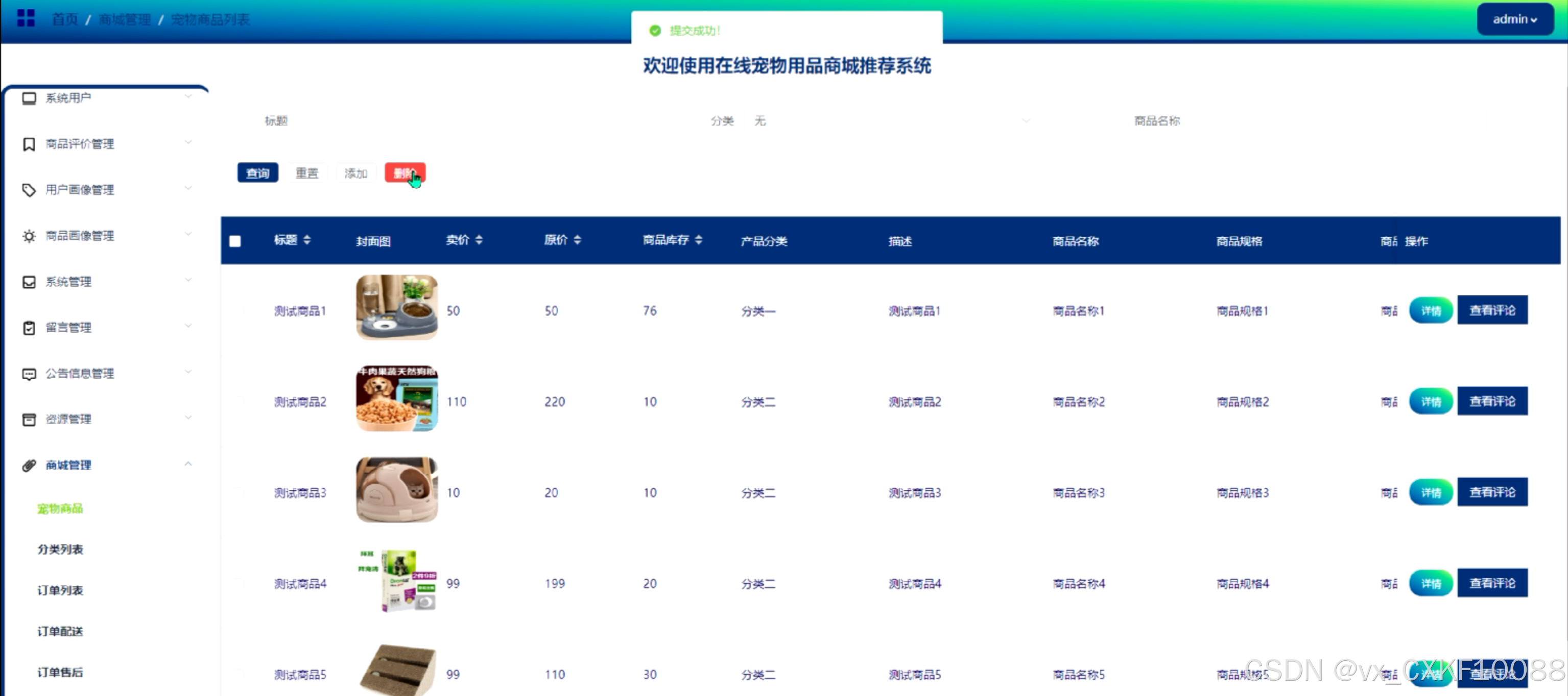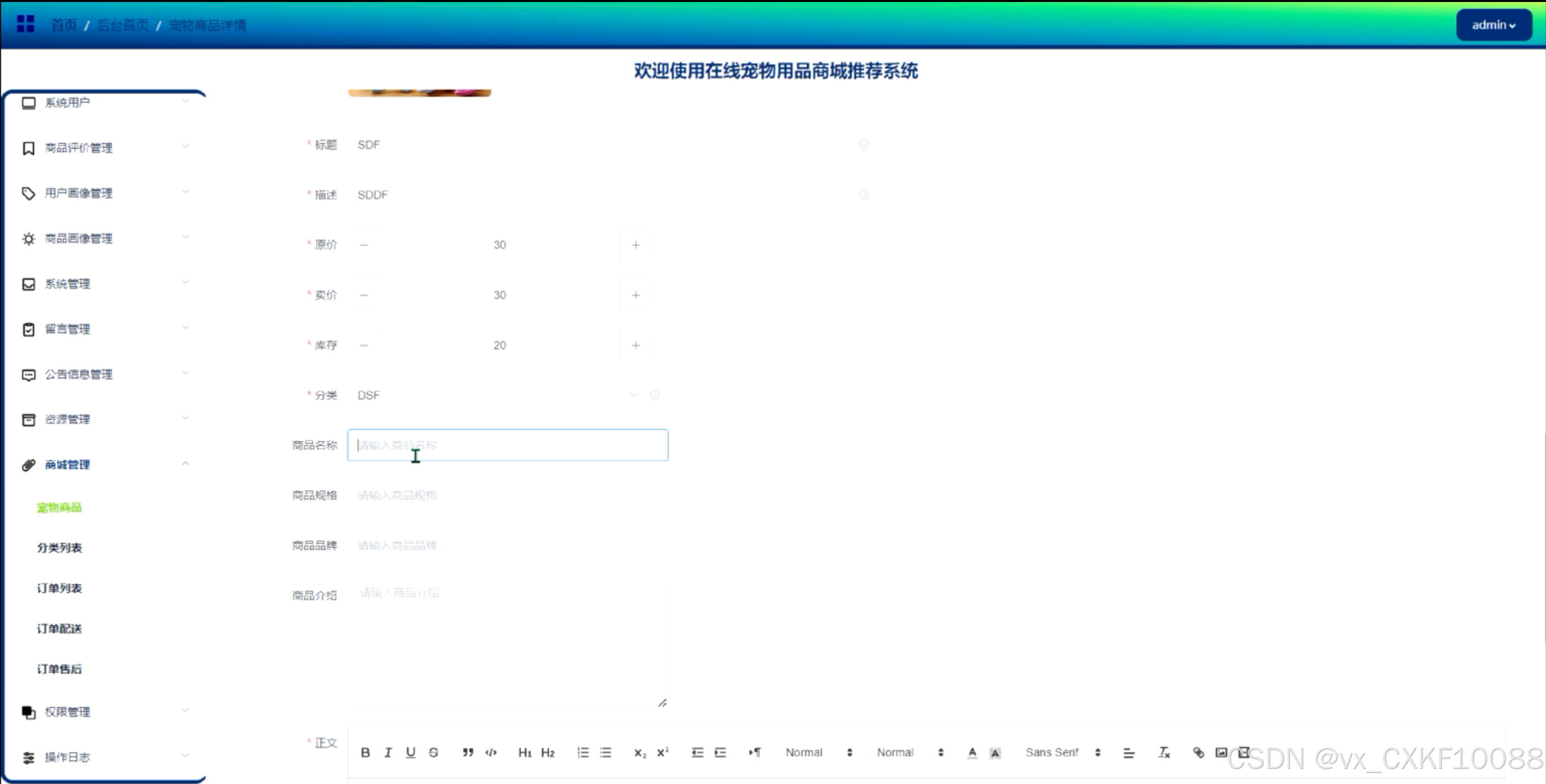 | 测试流程 | (1)管理员登录,点击“商城管理”,再点击“宠物商品-添加”,填写相关信息。 (2)点击确认按钮提交 |