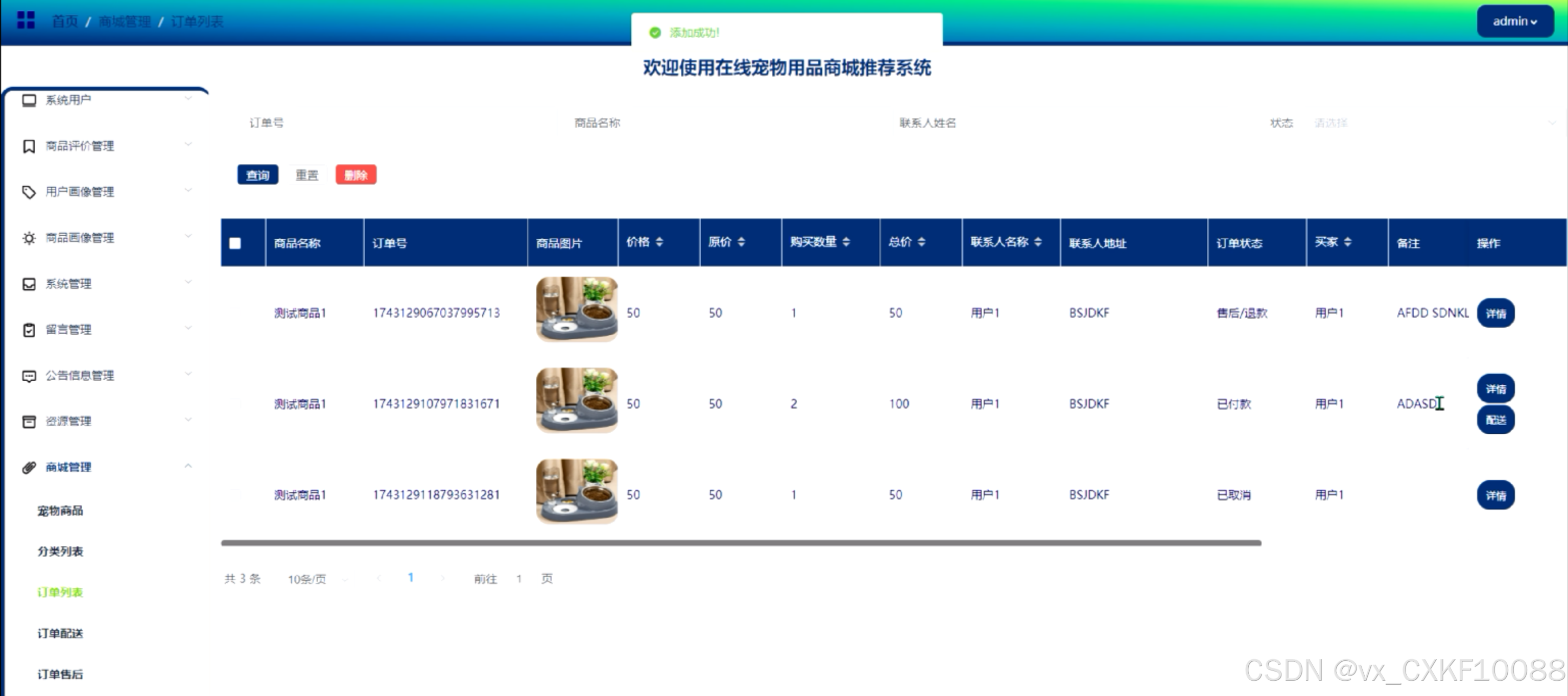 商城管理:商城管理包含宠物商品、分类列表、订单列表、订单配送和订单售后。管理员可添加商品分类信息、宠物商品信息,可查看用户的订单列表并进行配送和物流跟踪,同时可对用户的售后信息进行回复处理。界面图如下。