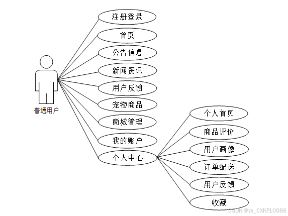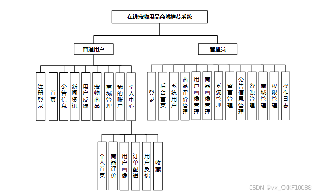 按照在线宠物用品商城推荐系统的角色,划分为了注册用户、商家用户和管理员这三大部分。