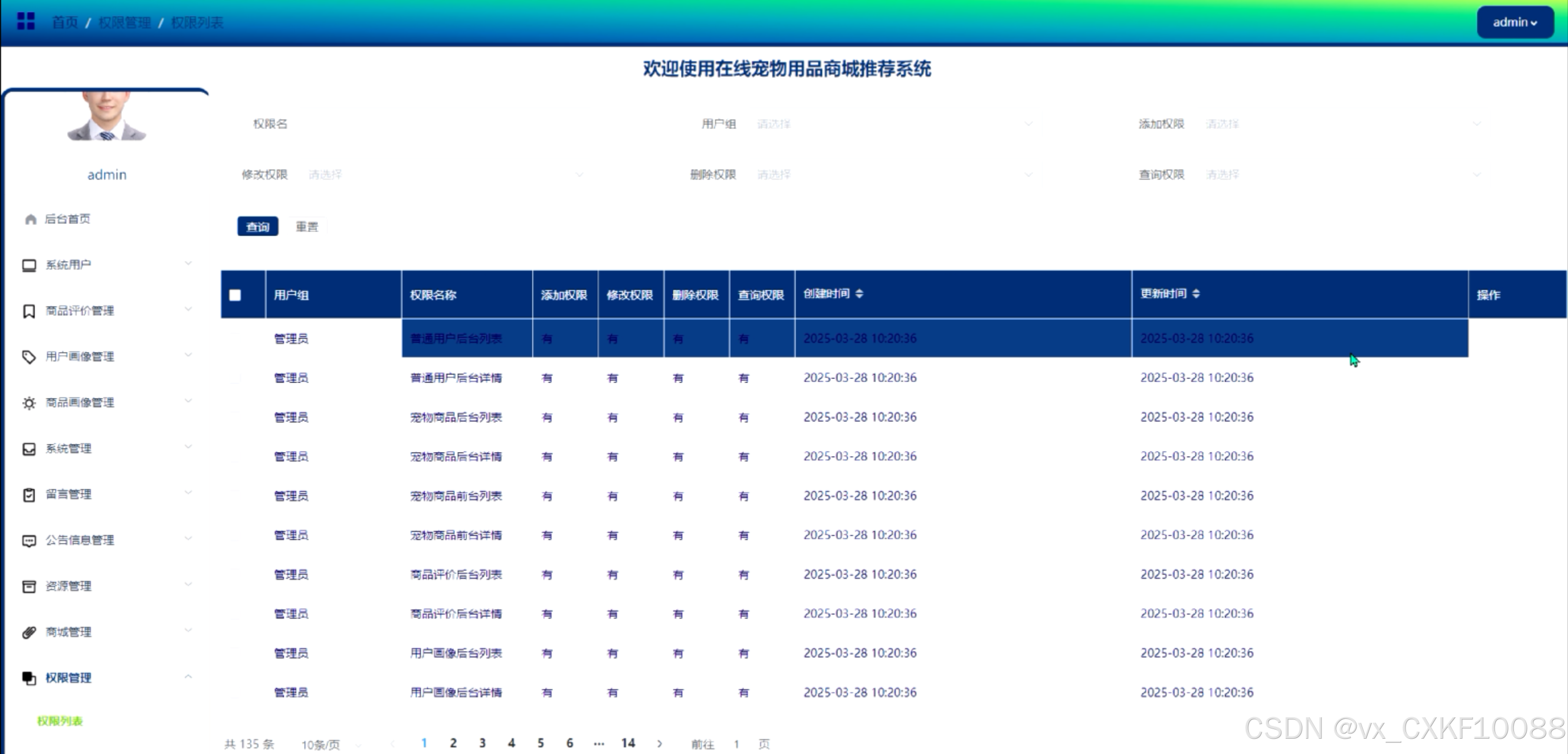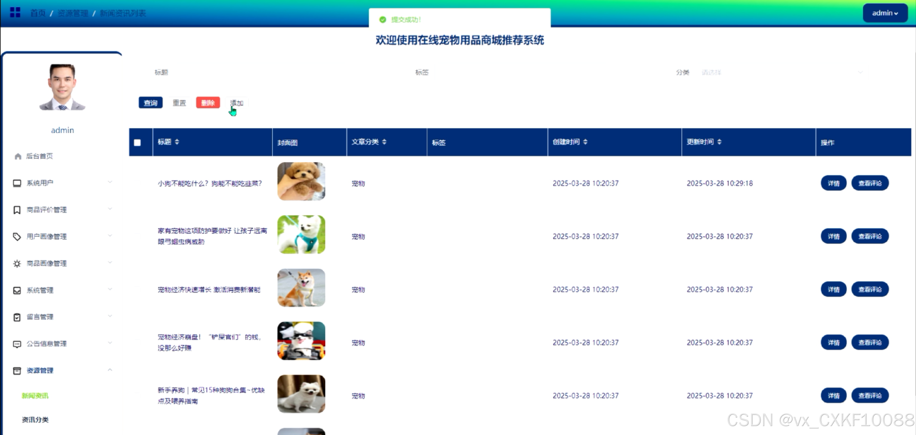资源管理:资源管理功能允许管理员对新闻资讯进行有效的管理和维护。此功能包括查询、重置和删除特定的新闻资讯,确保内容的准确性和时效性。通过这些操作,管理员可以及时更新和发布有关宠物护理、产品信息和其他相关内容,从而提升用户的知识水平和购物体验。界面图如下。