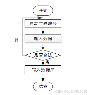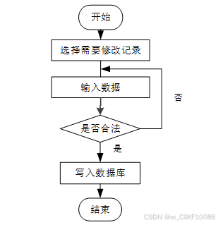 用户首先选择需要修改的记录,输入修改后的数据,系统判断输入数据是否合法。若数据不合法,提示重新输入;若数据合法,则将修改后的数据写入数据库,完成操作后流程结束。修改信息流程图如图2-6所示。