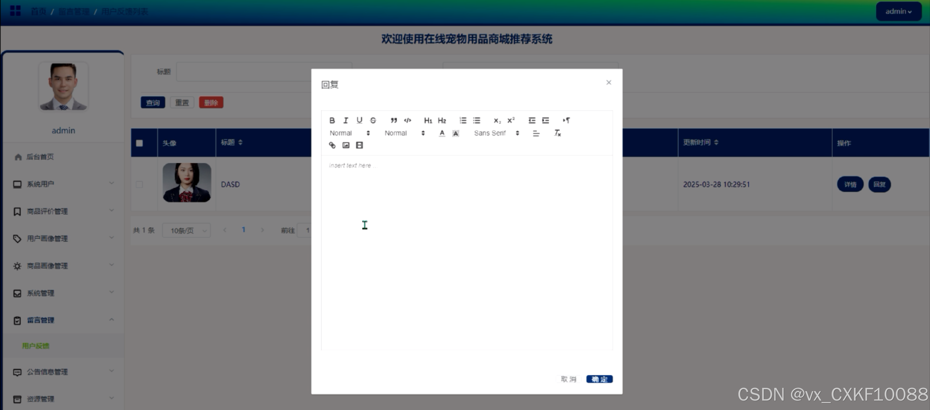 留言管理:管理员点击可查看用户反馈列表,可查看详情并对反馈信息进行回复。界面图如下。