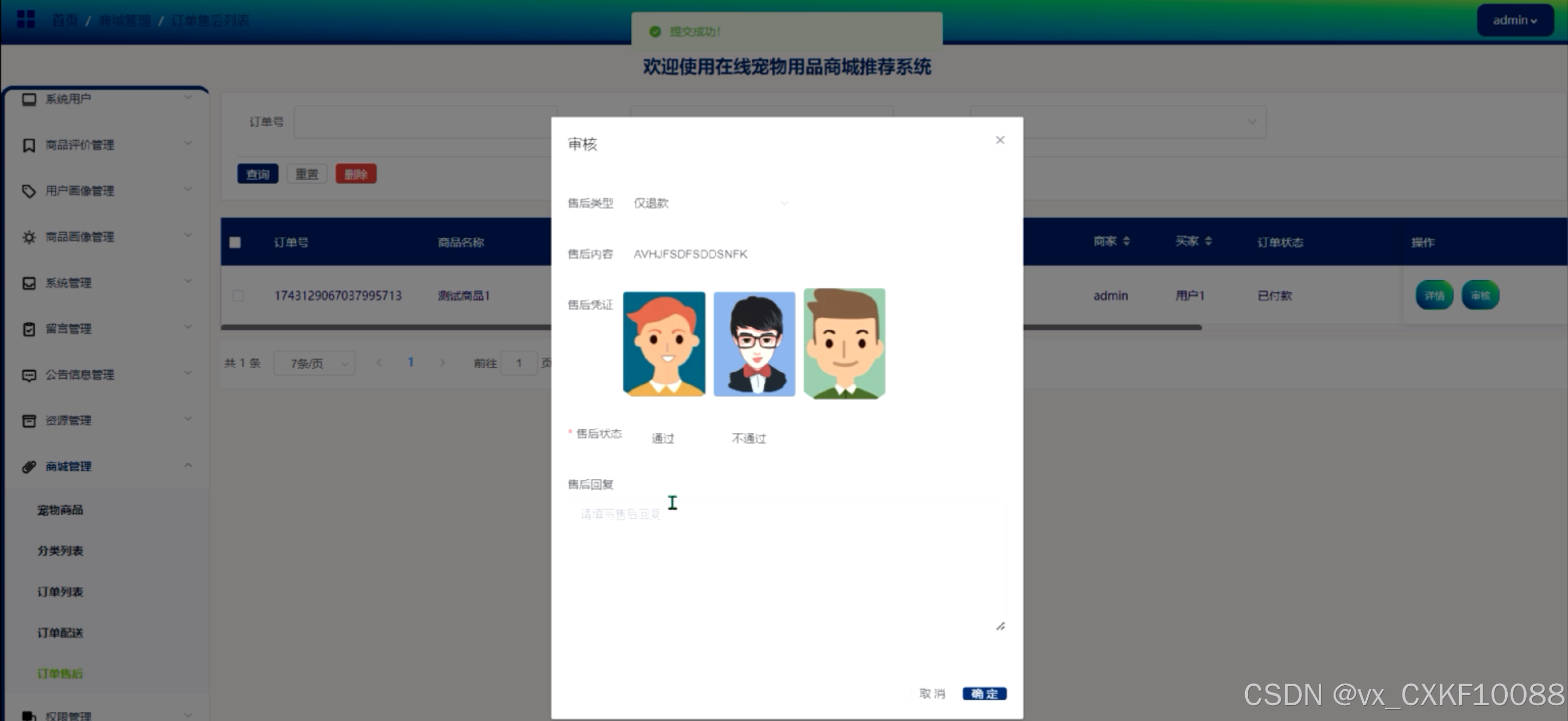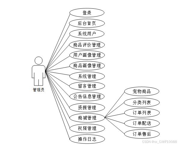 (11)商城管理:商城管理包含宠物商品、分类列表、订单列表、订单配送和订单售后。管理员可添加商品分类信息、宠物商品信息,可查看用户的订单列表并进行配送和物流跟踪,同时可对用户的售后信息进行回复处理。