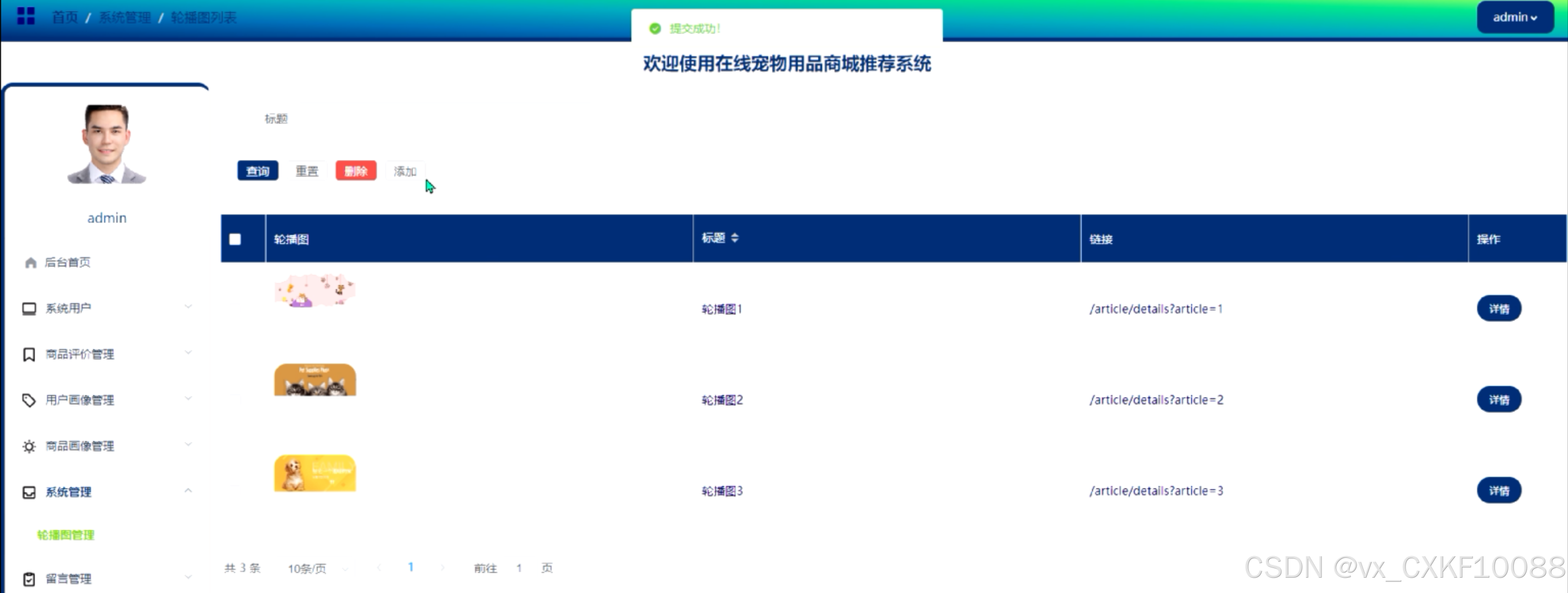 系统管理:系统管理页面中的轮播图管理功能,允许管理员轻松上传、编辑和删除首页展示的轮播图片。通过这一功能,管理员可以定期更新重要信息和活动预告,确保用户及时获取最新动态。界面图如下。