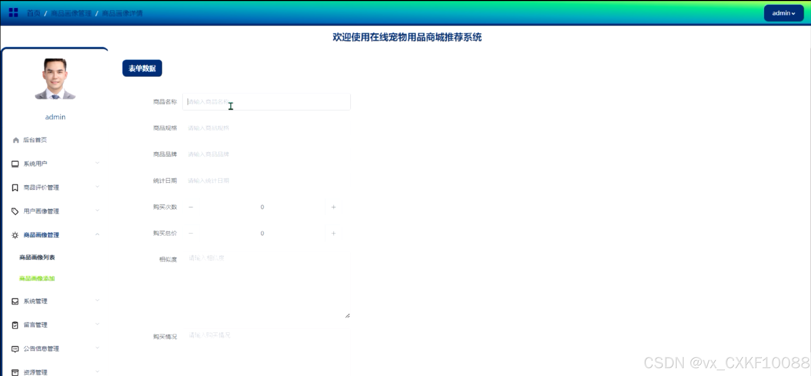 (6)商品画像管理:管理员点击可查看商品画像列表和商品画像添加;点击进入“商品画像添加”可填写相关信息,包括商品名称、商品规格、商品品牌、统计日期、购买次数、购买总价、相似度、购买情况。管理员也可通过点击“下载导入文档”导入商品画像信息。