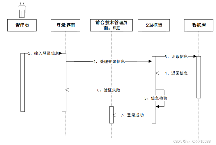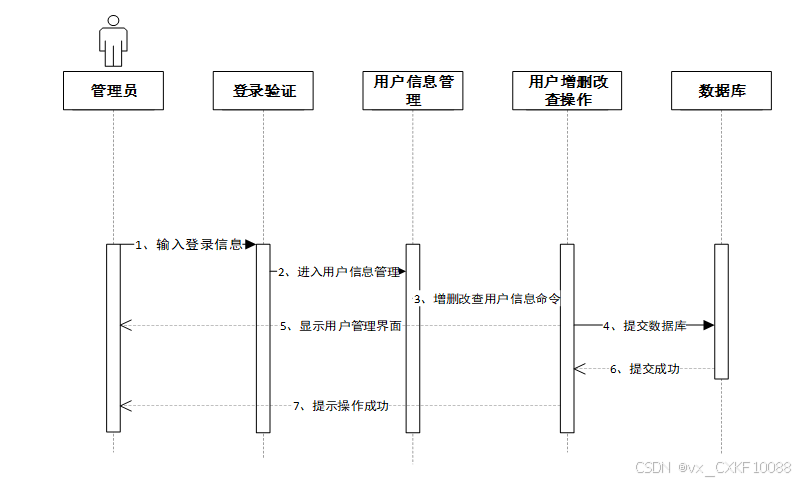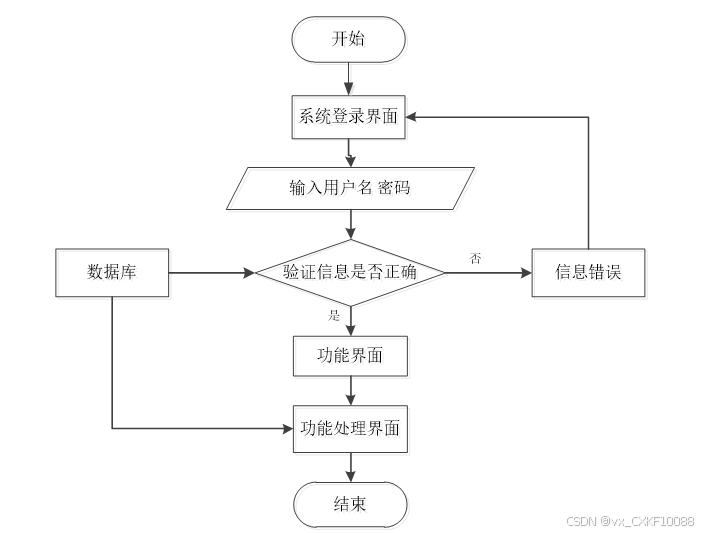 用户从“系统登录界面”开始,输入用户名和密码后,系统验证其信息是否正确。如果验证通过,则进入功能界面并进一步进入功能处理界面,最后流程结束;如果验证失败,则显示“信息错误”,用户需要重新输入。数据库支持验证过程。如图3-3所示。