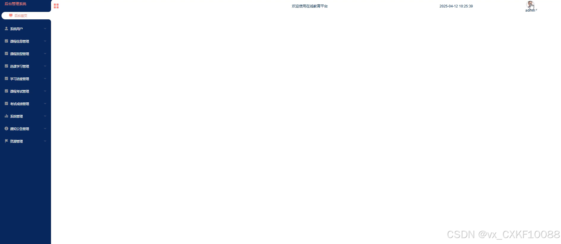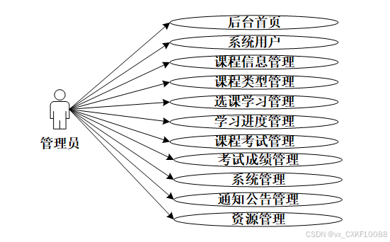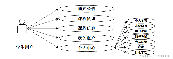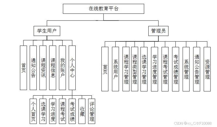 系统总体功能设计旨在构建一个全面支持学生学习与管理需求的在线教育平台。包括首页信息展示、通知公告发布、课程资讯浏览、选课学习、学习进度跟踪、课程考试及成绩查询等功能模块,为学生提供便捷的学习体验;同时,通过后台管理系统实现对用户、课程信息、学习进度、考试及成绩等的高效管理,并支持资源管理和系统设置。整个设计以提升教学质量和用户体验为核心,确保系统的易用性、扩展性和稳定性。系统功能结构图如图4-2所示。