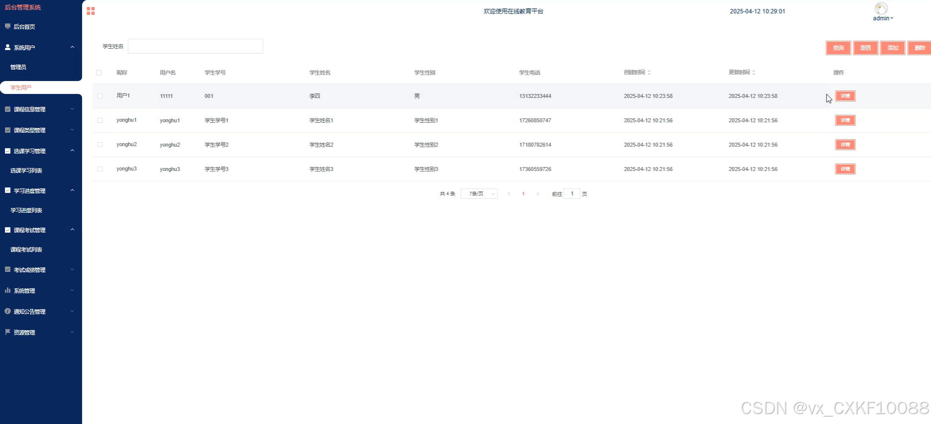 系统用户管理:负责维护管理员和学生用户的账号信息,包括创建新用户、修改权限、重置密码等操作,保证系统的安全性与正常运作。