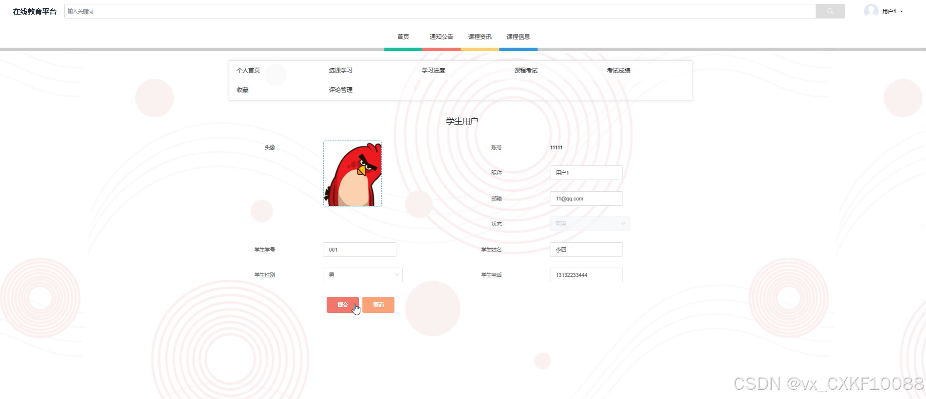 个人中心:汇集了个人信息、选课学习、学习进度、课程考试、考试成绩、收藏和评论管理等功能,为学生提供一站式服务。学生可以轻松查看和编辑个人信息,追踪学习进展,参与在线考试,管理收藏与评论,实现自主学习和个性化发展。此模块简化了学习流程,增强了互动性,提升了整体用户体验。