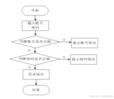 用户输入账号和密码后,系统首先判断账号是否正确,若不正确则提示“账号错误”;如果账号正确,则继续判断密码是否正确,若密码错误则提示“密码错误”;若账号和密码均正确,则显示“登录成功”,最后结束流程。如图3-4所示。