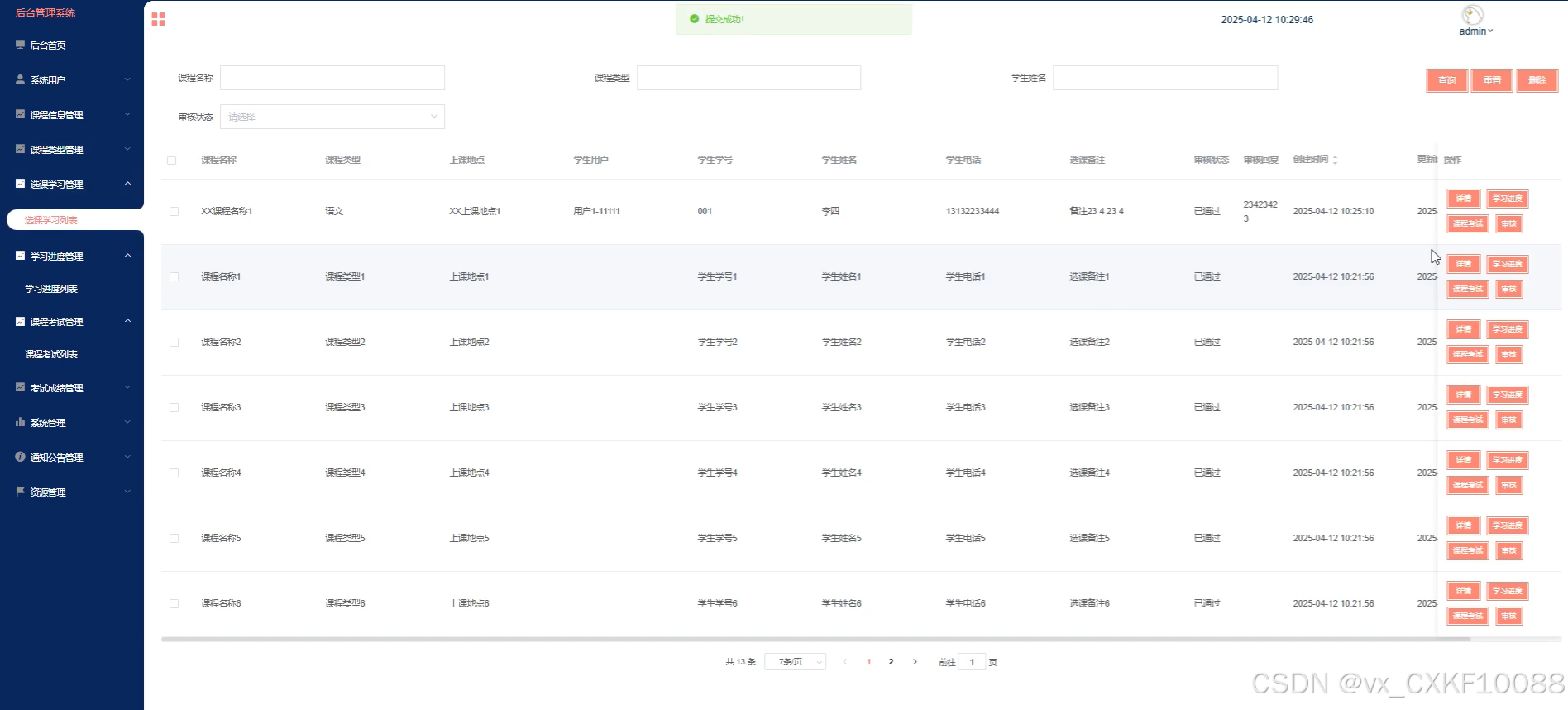 课程信息管理:集中管理和更新所有课程的基本信息,如课程名称、描述、学分等,确保课程资料准确无误,便于学生查询和选择。