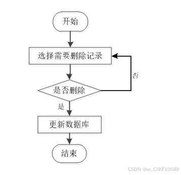 用户首先选择需要删除的记录,然后系统判断是否执行删除操作。如果用户选择不删除,则返回重新选择;如果选择删除,则更新数据库完成记录删除操作,最后结束流程。如图3-6所示。
