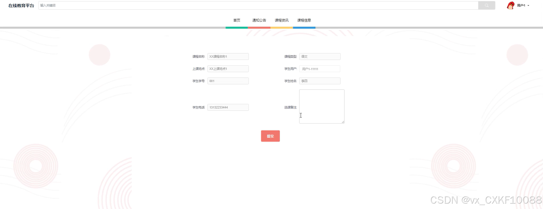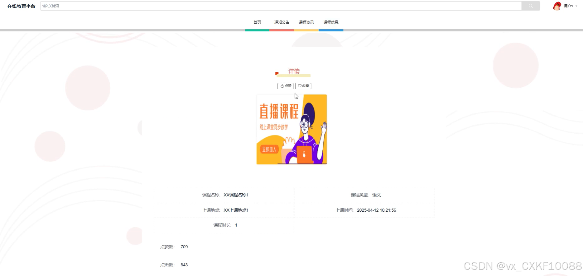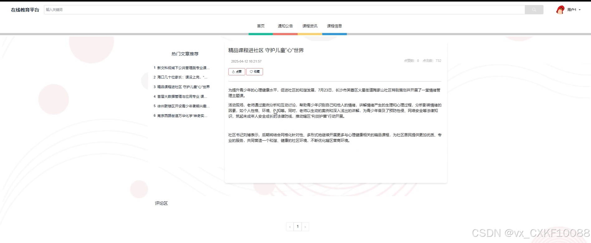 首页:作为平台的核心入口,学生首页展示了最新通知公告、推荐课程资讯和热门课程信息,旨在为学生提供一站式的信息服务体验,帮助他们快速获取所需资源并进行学习计划的制定。