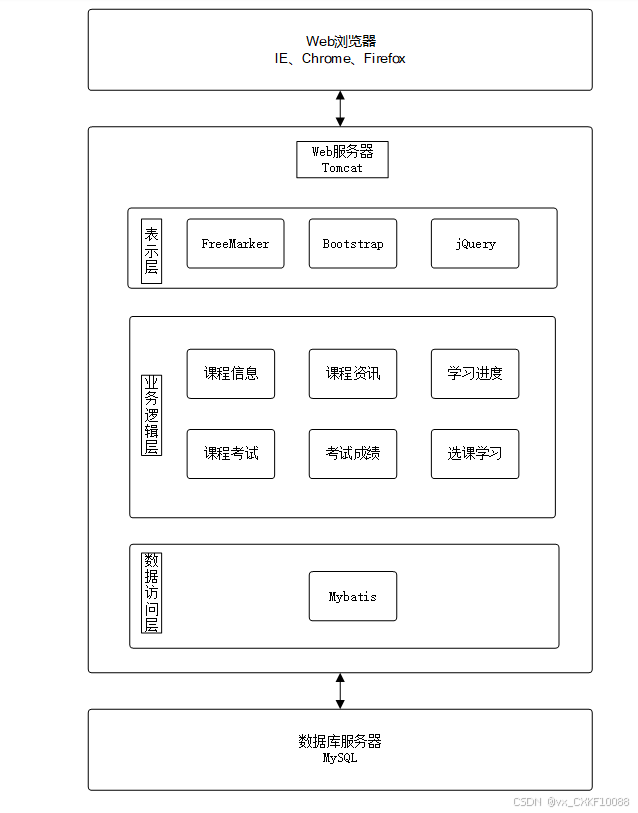 系统由表现层、业务逻辑层、数据访问层和数据库服务器组成。表现层通过浏览器(如IE、Chrome、Firefox)与用户交互,采用FreeMarker、Bootstrap、jQuery等技术实现界面呈现。业务逻辑层负责处理系统的核心业务逻辑,通过分模块设计实现功能分离。数据访问层使用MyBatis框架连接数据库,执行数据的增删改查操作。数据库服务器采用MySQL进行数据存储和管理,为系统提供稳定的数据库支持。整个架构通过Tomcat服务器完成用户请求的接收和处理,确保系统的高效运行[8]。整个系统架构如图4-1所示。