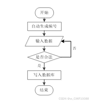 系统开始后自动生成编号,用户输入数据。系统判断输入的数据是否合法,若不合法则返回重新输入;若合法,则将数据写入数据库,最后结束流程。如图3-5所示。