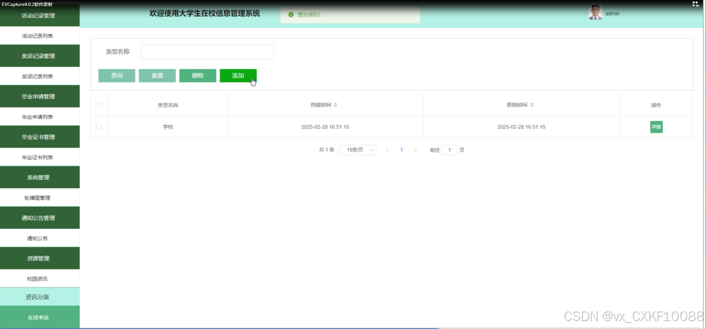 - 资源管理:管理员可以管理校园资讯和资讯分类,包括查询、重置、删除、详情查看和添加操作,同时,也能对资源进行全面管理。