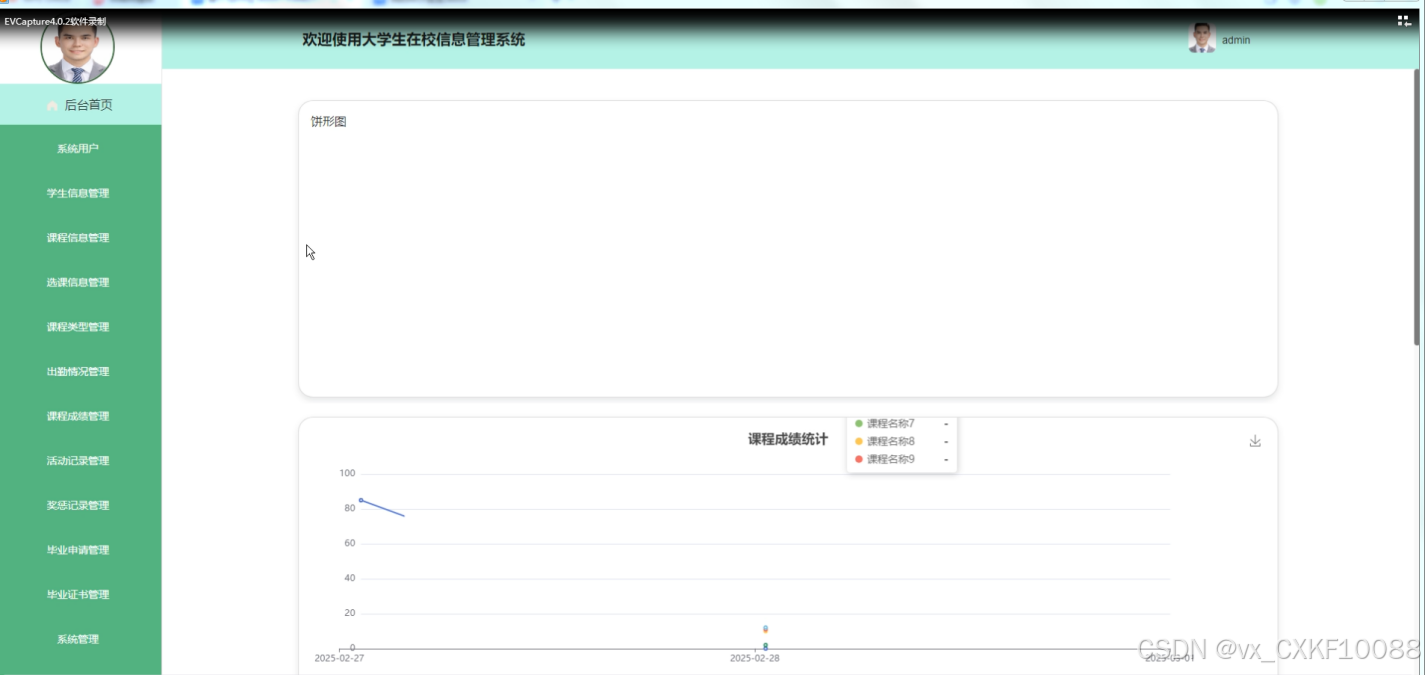 - 后台首页:管理员在后台首页拥有更为全面的管理权限。查看包括出勤情况统计、课程成绩统计图。通过这些功能,管理员能够有效地维护系统的正常运行,保障教学活动的顺利进行。