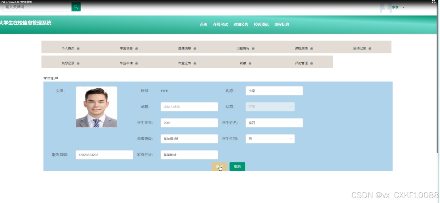 - 个人中心:学生用户可以在此页面查看查看个人首页、学生信息、选课信息、出勤情况、课程成绩、活动记录、奖惩记录、毕业申请、毕业证书、收藏、评论管理等操作,设置个人偏好。