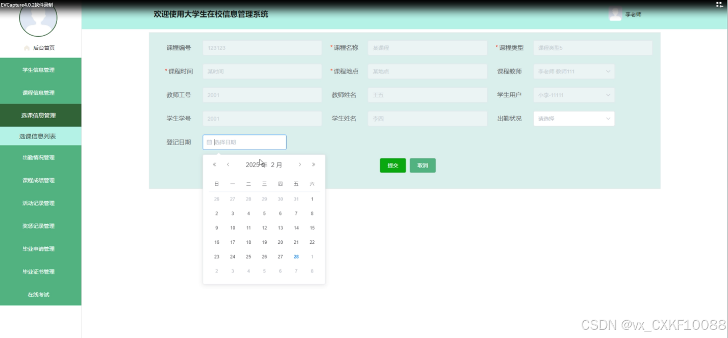 - 选课信息管理:管理员可以全面管理选课信息,包括查询、重置、删除选课信息,添加新的选课信息,进行出勤登记,管理课程成绩,审核选课申请等。