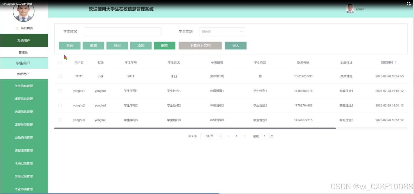 - 系统用户管理:管理员可以查看、编辑、删除所有用户信息,包括管理员、学生用户和教师用户。同时,管理员可以批量导入或导出用户数据,以及重置用户密码。