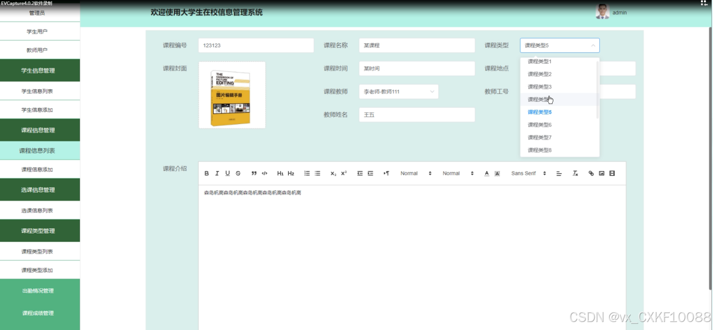 - 课程类型管理:管理员可以管理课程类型,包括查询、重置、删除现有课程类型,以及添加新的课程类型。