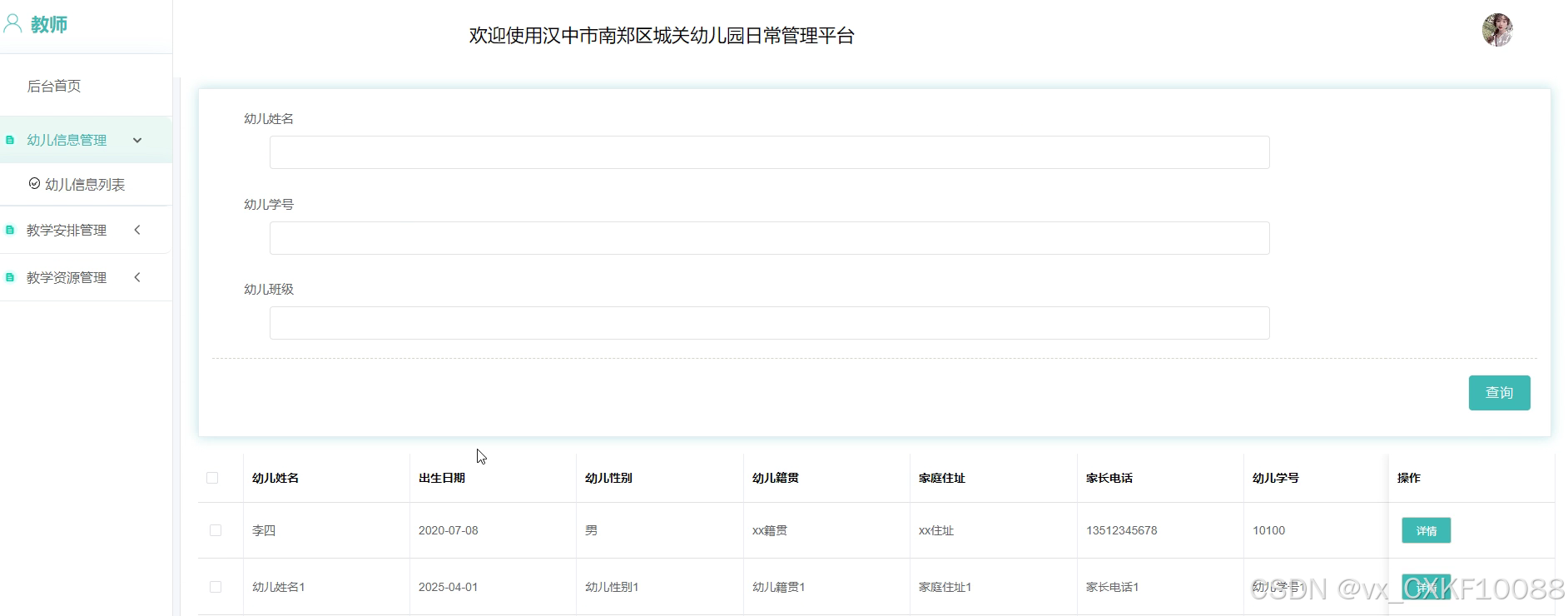教师可以查看幼儿的基本信息,包括幼儿姓名、年龄、班级、出生日期等。此功能有助于教师了解每个孩子的成长和学习情况,及时提供个性化教育支持。幼儿信息管理界面如下图5-14所示。