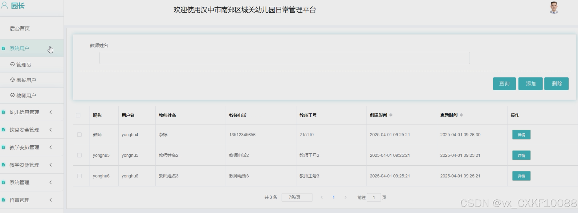 - 系统用户管理:管理员可以管理平台的用户,包括管理员、家长用户和教师用户。可以查看、添加、删除或修改用户信息,确保系统的正常运作和权限分配。