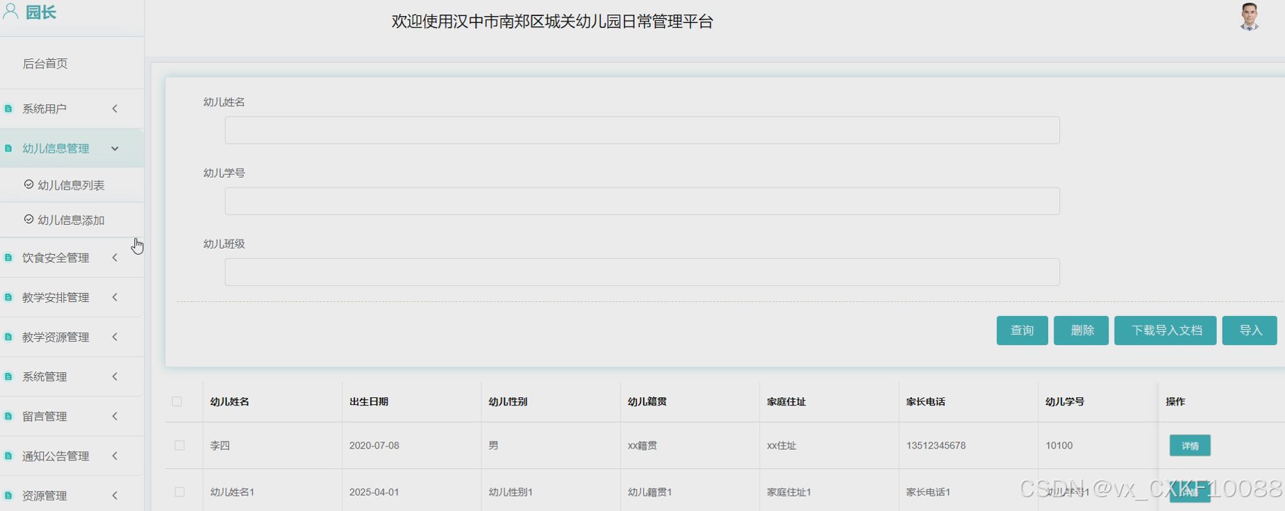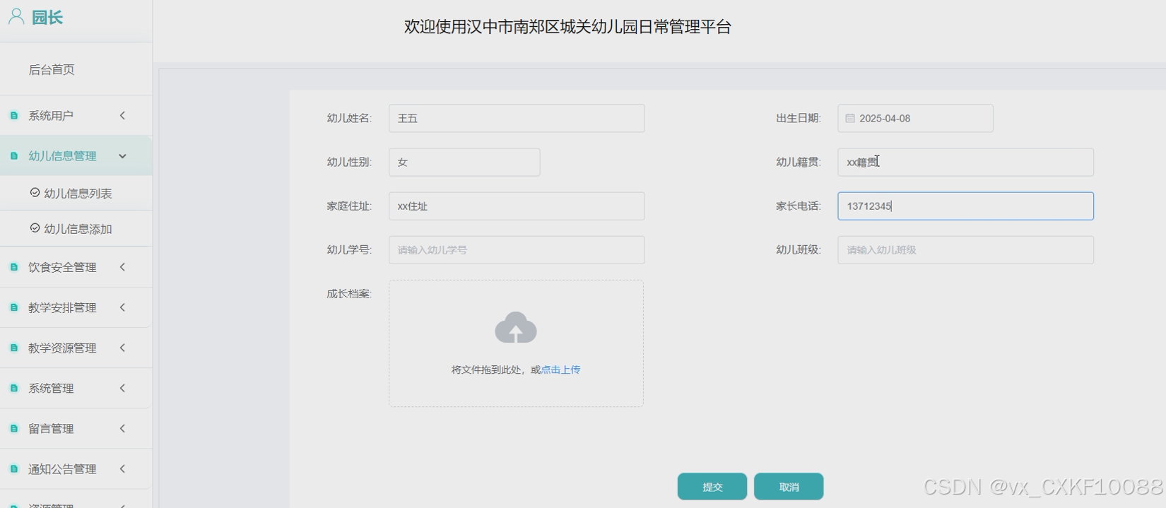 - 幼儿信息管理:管理员负责管理幼儿的个人信息和健康记录,确保所有数据准确无误。平台提供便捷的编辑和查询功能,帮助管理员快速更新幼儿信息。