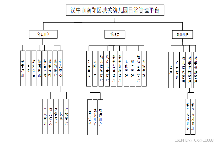 随着信息技术的不断发展,传统的幼儿园管理模式逐渐暴露出许多效率低下、管理不便的问题,尤其在管理各类信息如幼儿信息、教学安排、家长互动等方面亟需改善。因此,开发一款适用于汉中市南郑区城关幼儿园的日常管理平台,通过信息化手段提升管理效率与服务质量,已经成为当务之急。该平台将为管理员(园长)、家长用户、教师用户提供不同功能模块,满足各自的需求,从而实现信息的高效共享与管理。该平台设计包含三个主要用户角色:管理员(园长)、家长用户和教师用户。管理员(园长)可通过后台系统进行系统用户管理、幼儿信息管理、饮食安全管理、教学安排管理等操作。此外,平台还支持教学资源管理、留言反馈与通知公告管理,确保信息的及时传递与反馈。家长用户则可以通过平台查看通知公告、新闻资讯、教学安排等内容,并能通过留言反馈功能与教师互动。教师用户则负责幼儿信息管理、教学安排、教学资源的管理工作,确保教学活动的顺利进行。