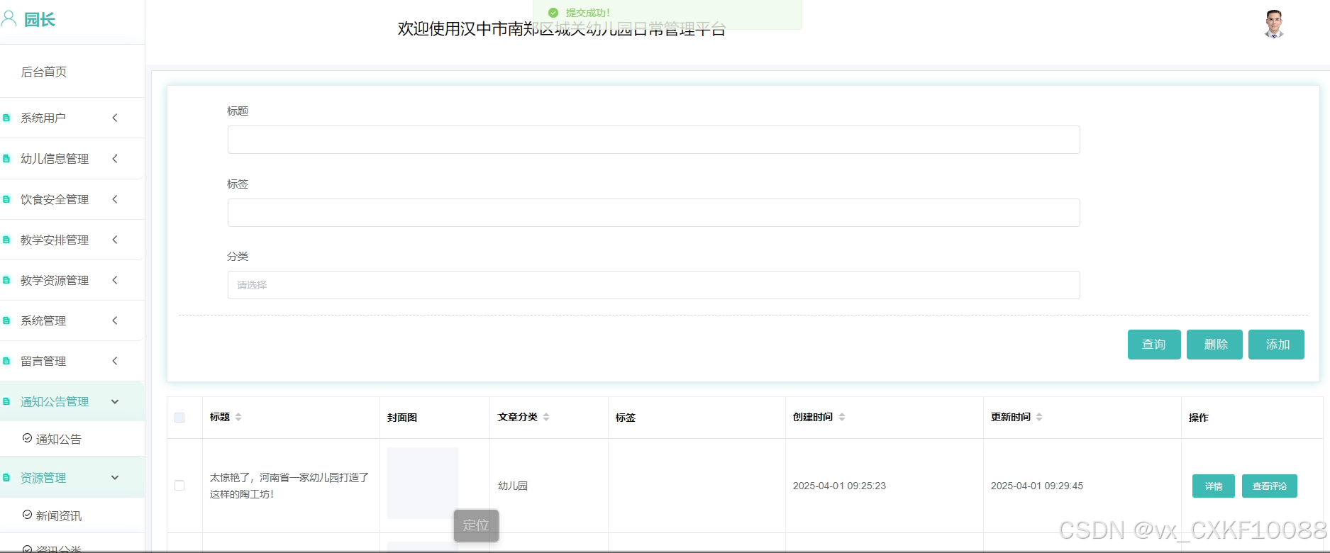 - 资源管理:管理员管理平台的新闻资讯和资讯分类,确保教育相关的最新资讯能够及时发布,并能根据类别进行整理,方便用户查阅。