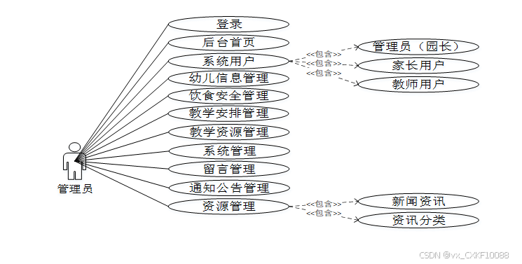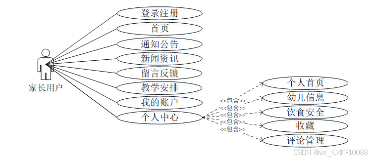 家长用户具备注册登录、首页、通知公告、新闻资讯、留言反馈、教学安排、我的账户、个人中心(个人首页、幼儿信息、饮食安全、收藏、评论管理)等需求用例,详细用例图如图3-1所示。