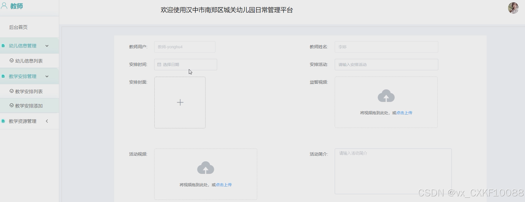 后台首页:登录后,教师进入平台的后台首页,展示关键管理信息和操作入口,包括幼儿信息、教学安排和教学资源等模块,帮助教师快速访问和处理日常工作内容。