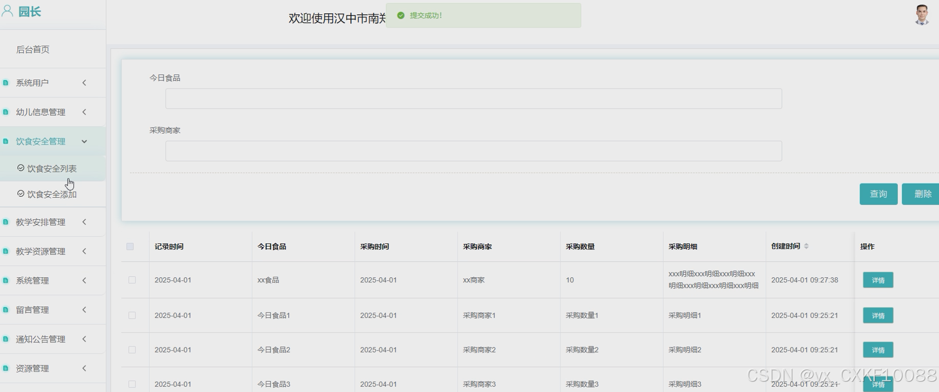 - 饮食安全管理:该功能帮助管理员查看和管理幼儿的饮食记录和安全情况,确保孩子们的饮食符合健康标准,并能够及时处理反馈问题。