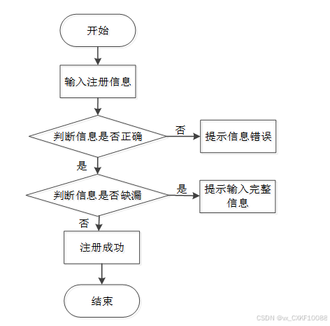 未有账号的用户可进入注册界面进行注册操作,填写注册表格,包括用户名、密码、电子邮件等必要信息。后台系统验证并保存用户提交的信息。分配唯一用户标识符。注册成功后,用户可以使用账号密码进行登录。用户注册流程图如下图所示。