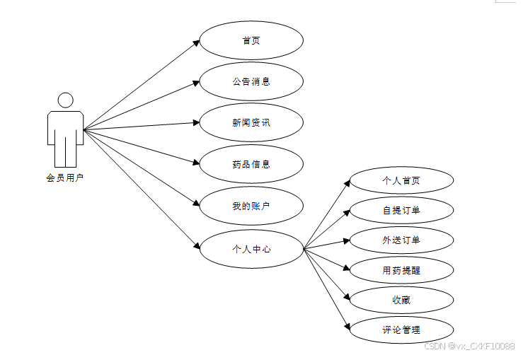 系统功能需求分析主要集中在为不同用户提供便捷、灵活的操作界面和高效的管理功能。对于会员用户,系统应支持药品信息查询、购药、设置用药提醒、收藏喜欢的商品以及管理评论等基本功能,同时提供药品推荐和查询服务,确保顾客能够根据自身健康状况合理选择药品。对于管理员用户,系统需要支持全面的药品信息管理(包括库存预警、药品入库、处方药管理)、供应商管理、订单处理、员工信息维护、公告消息发布及资源管理等功能,帮助管理人员高效地进行日常运营和决策制定。此外,管理员还需具备数据统计与分析的能力,以优化药品资源配置和服务质量。系统还应具备严格的权限管理机制,确保不同角色用户的操作权限得到合理分配,保障数据的安全性和一致性。通过这些功能的实现,医药连锁店管理系统不仅提升了内部工作效率,也为顾客提供了更加安全、便捷的服务体验。具体功能如下: