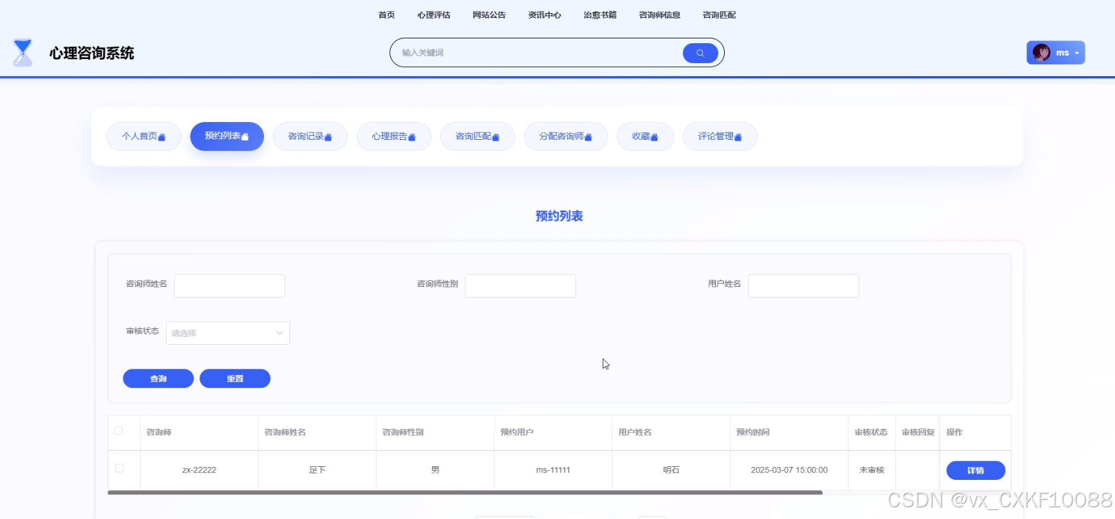 预约列表管理:咨询师可以查看所有预约请求及其详情,对于每个预约请求都可以进行审核并回复,保证咨询服务安排合理有序,提升用户满意度。